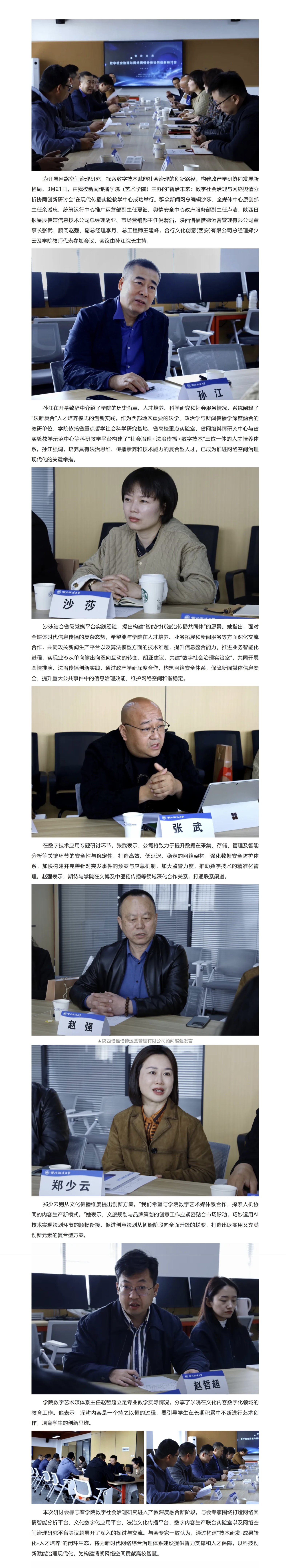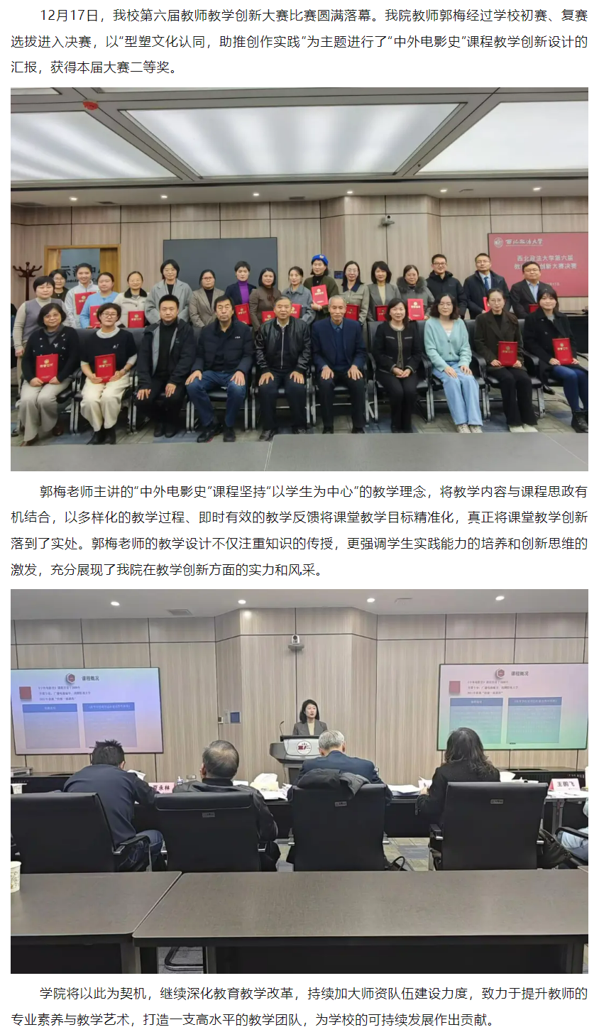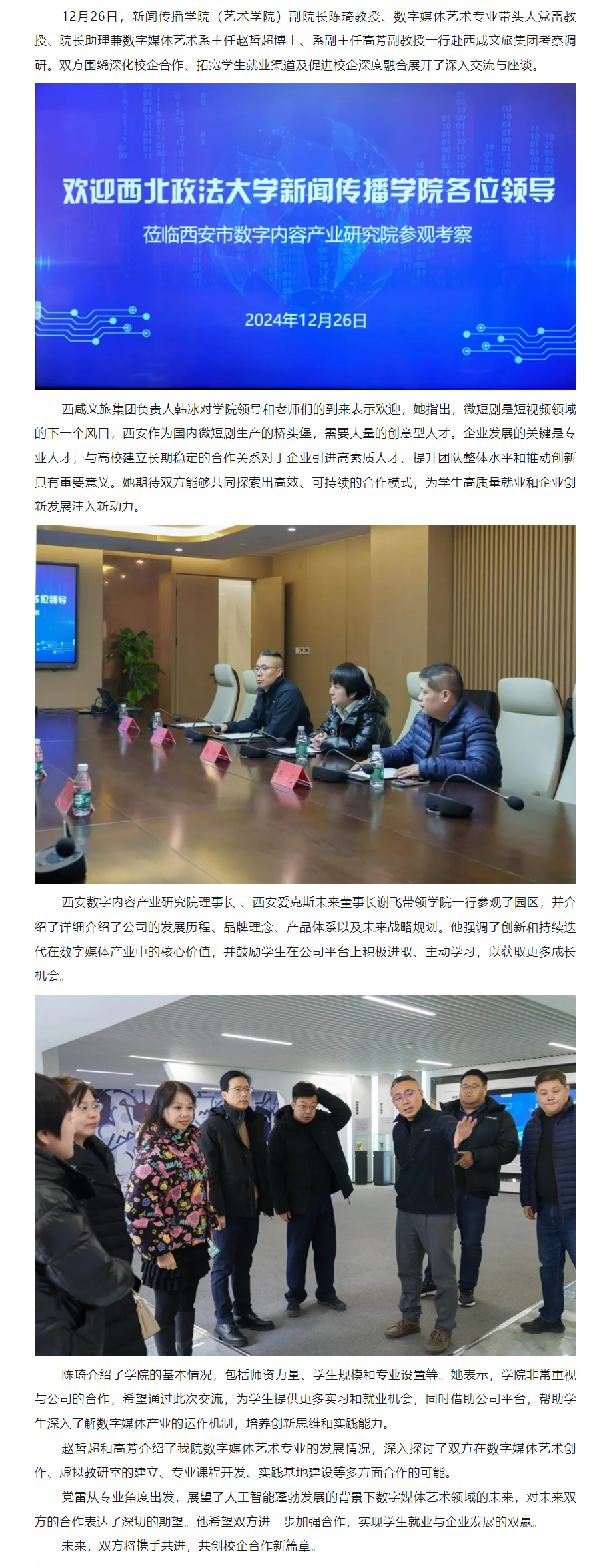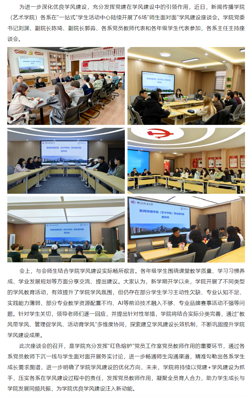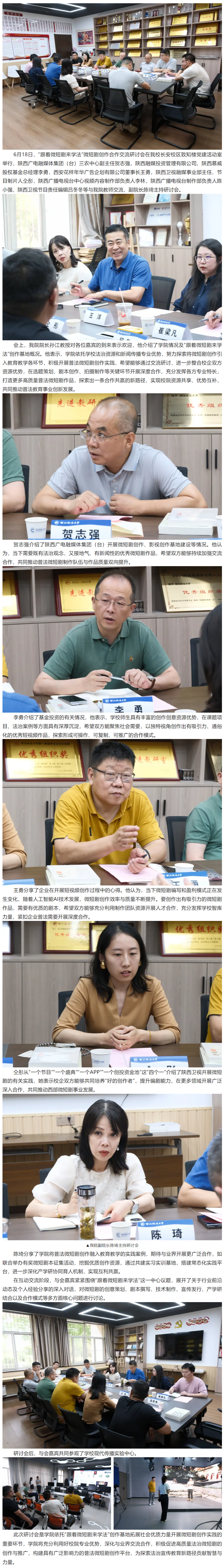为深入贯彻落实党的二十届三中全会精神,加强协会与高校合作,培育高素质电影专业人才,12月11日,共建高水平电影人才培养机制座谈会在我校长安校区致知楼举行。陕西省文联党组成员、专职副主席蔺雨,陕西省电影家协会主席、西影集团总经理黄献松,我校党委副书记、纪委书记、监察专员刘志彬出席座谈会,陕西省电影家协会主席团成员、做爱视频 党政负责人及教师代表参加座谈会。 陕西省文联党组成员、专职副主席蔺雨对西法大新闻教育深厚的历史沿革背景表示赞赏。他说,以何微为代表的中国新闻教育奠基人创建了党的新闻理论,做出了重要学术贡献。西法大做爱视频 发展基础好,优势独特。希望学校加强与省电影家协会、省电视艺术家协会、省民间艺术家协会、省美术家协会等协会的合作,通过承办影评大赛、短视频大赛,举办学术论坛等活动,充分发挥高校与协会合作的平台优势,为电影人才成长创造新机遇,开辟更为多元的成长成才路径,展现青年电影人未来更多的可能性。\ 陕西省电影家协会主席、西影集团总经理黄献松表示,西法大电影相关专业很有特色。高校作为电影艺术研究的沃土与摇篮,承载着培育电影人才的使命,大学生不仅是电影消费的主体,更是电影行业未来重要的后备人才。当前电影行业发展迅速,需要青年一代新鲜血液的输入,助力电影行业高质量发展。希望通过此次座谈会,进一步加强与西法大的合作交流,充分协会与高校各自优势,建立电影研究基地,发挥高校智库作用,推动西部电影谱写新篇。 我校党委副书记、纪委书记、监察专员刘志彬表示,感谢省文联、省电影家协会对我校电影人才培养工作的重视。他说,培养电影人才是一项意义深远、久久为功的工程,需要多方齐心协力、共同努力。高校要加强与行业协会的沟通交流,开展密切合作,携手搭建多元化实习实践平台,共建电影人才培养新方式、新机制。高校教师要积极参与协会工作,在项目合作的过程中,充分发挥自身优势,为学生提供与行业专家交流学习的机会,提高学生在创意策划、拍摄制作等方面的电影创作能力。希望协会与高校携手,通过务实高效合作,形成一批高质量成果。 做爱视频 院长、教授、博士生导师孙江介绍了我校新闻教育历史沿革、教学科研和人才培养情况。学院重视电影相关学科建设,拥有戏剧与影视艺术专业硕士学位授予权,广播电视编导和戏剧影视文学等4个专业先后获批为陕西省一流专业建设项目。学院培养了一批优秀的电影从业者。数字媒体艺术系主任赵哲超、戏剧影视文学系主任曾静蓉、广播电视编导系主任李璐分别介绍了电影相关专业学生培养情况,展示出学院电影人才培养的独特优势。 与会嘉宾在交流中表示,要共同致力于培养具备专业技能、创新思维与艺术素养,能适应电影行业发展需要的高质量电影人才,要立足于人工智能赋能,利用新科技手段提升电影人才专业水平,要落实协会、企业与高校合作内容,为学生提供更多实习就业机会,要充分发挥各自资源优势,加强交流合作实现互利共赢。 座谈会由做爱视频 党委书记刘渊主持。陕西省电影家协会副主席、陕西旅游集团影视文化有限公司总经理张珂珂,陕西省电影家协会副主席、西安博纳影院管理有限公司总经理李军练,陕西省电影家协会秘书长王珍,陕西省电影家协会副秘书长、西影集团艺管中心主任沈亚荣,校纪委机关综合室主任燕楠,做爱视频 副院长、教授陈琦,陕西省电影家协会副主席、做爱视频 教授党雷,戏剧影视文学系副主任杨晓,广播电视编导系副主任郭梅,数字媒体艺术系副主任高芳参加座谈会。会后,与会嘉宾参观了我校校史馆和现代传播实验中心。