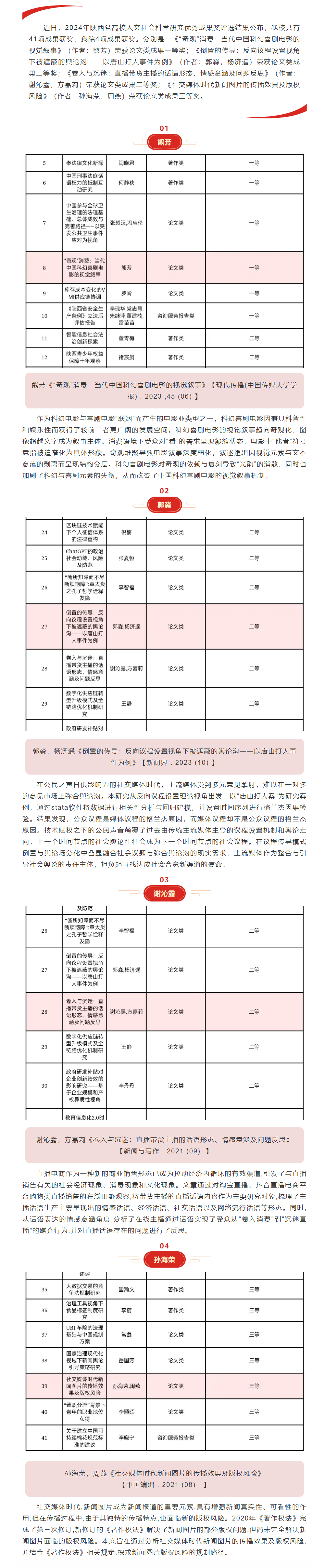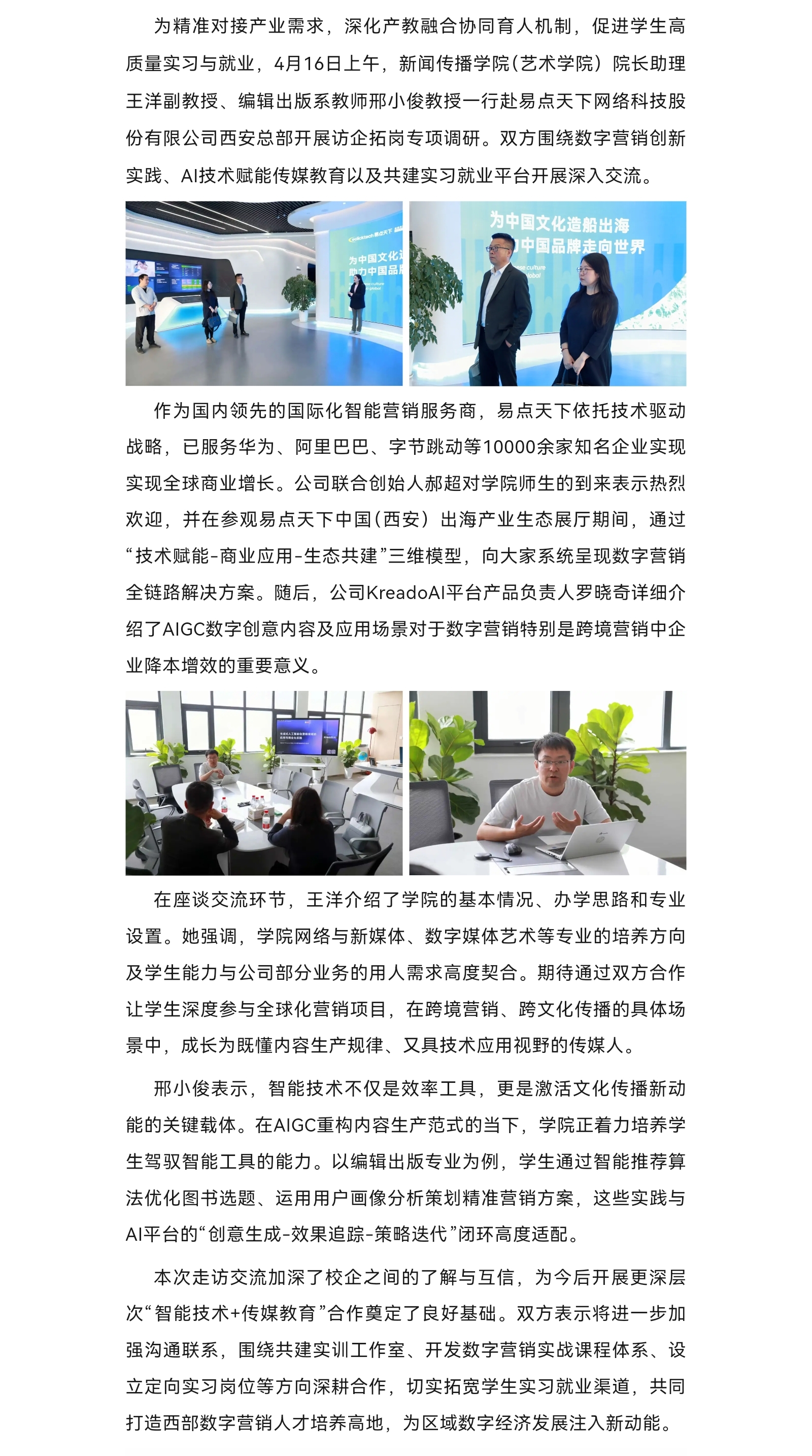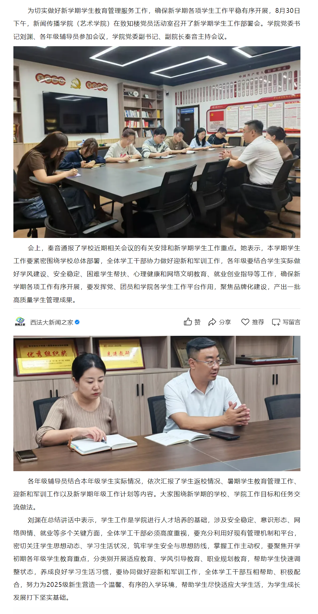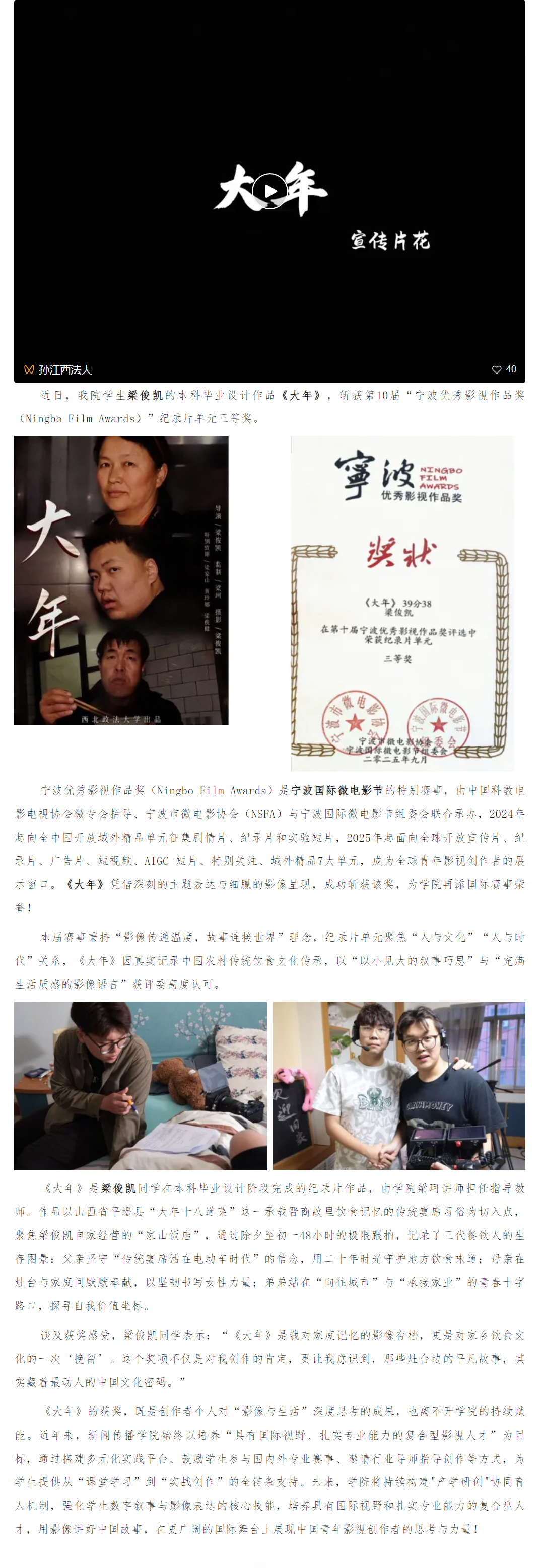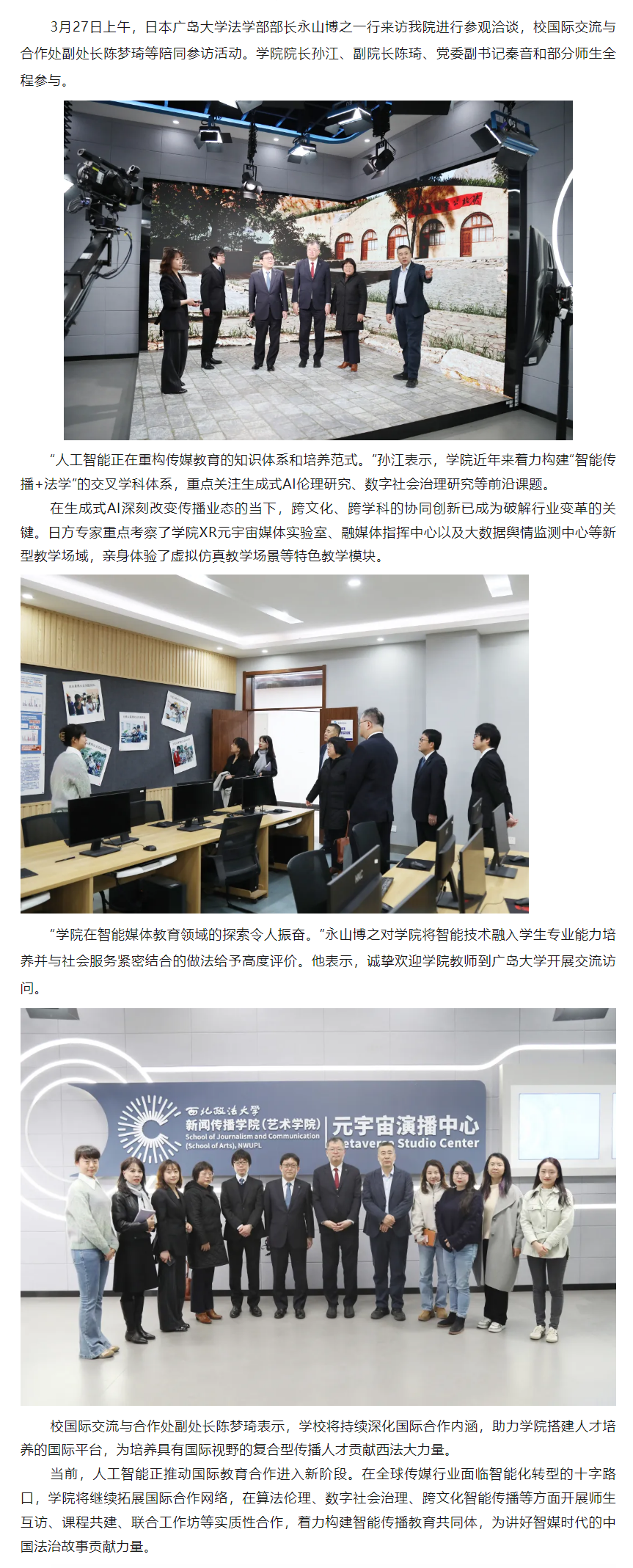 为深入贯彻落实党的二十届三中全会精神,加强协会与高校合作,培育高素质电影专业人才,12月11日,共建高水平电影人才培养机制座谈会在我校长安校区致知楼举行。陕西省文联党组成员、专职副主席蔺雨,陕西省电影家协会主席、西影集团总经理黄献松,我校党委副书记、纪委书记、监察专员刘志彬出席座谈会,陕西省电影家协会主席团成员、做爱视频 党政负责人及教师代表参加座谈会。 陕西省文联党组成员、专职副主席蔺雨对西法大新闻教育深厚的历史沿革背景表示赞赏。他说,以何微为代表的中国新闻教育奠基人创建了党的新闻理论,做出了重要学术贡献。西法大做爱视频 发展基础好,优势独特。希望学校加强与省电影家协会、省电视艺术家协会、省民间艺术家协会、省美术家协会等协会的合作,通过承办影评大赛、短视频大赛,举办学术论坛等活动,充分发挥高校与协会合作的平台优势,为电影人才成长创造新机遇,开辟更为多元的成长成才路径,展现青年电影人未来更多的可能性。\ 陕西省电影家协会主席、西影集团总经理黄献松表示,西法大电影相关专业很有特色。高校作为电影艺术研究的沃土与摇篮,承载着培育电影人才的使命,大学生不仅是电影消费的主体,更是电影行业未来重要的后备人才。当前电影行业发展迅速,需要青年一代新鲜血液的输入,助力电影行业高质量发展。希望通过此次座谈会,进一步加强与西法大的合作交流,充分协会与高校各自优势,建立电影研究基地,发挥高校智库作用,推动西部电影谱写新篇。 我校党委副书记、纪委书记、监察专员刘志彬表示,感谢省文联、省电影家协会对我校电影人才培养工作的重视。他说,培养电影人才是一项意义深远、久久为功的工程,需要多方齐心协力、共同努力。高校要加强与行业协会的沟通交流,开展密切合作,携手搭建多元化实习实践平台,共建电影人才培养新方式、新机制。高校教师要积极参与协会工作,在项目合作的过程中,充分发挥自身优势,为学生提供与行业专家交流学习的机会,提高学生在创意策划、拍摄制作等方面的电影创作能力。希望协会与高校携手,通过务实高效合作,形成一批高质量成果。 做爱视频 院长、教授、博士生导师孙江介绍了我校新闻教育历史沿革、教学科研和人才培养情况。学院重视电影相关学科建设,拥有戏剧与影视艺术专业硕士学位授予权,广播电视编导和戏剧影视文学等4个专业先后获批为陕西省一流专业建设项目。学院培养了一批优秀的电影从业者。数字媒体艺术系主任赵哲超、戏剧影视文学系主任曾静蓉、广播电视编导系主任李璐分别介绍了电影相关专业学生培养情况,展示出学院电影人才培养的独特优势。 与会嘉宾在交流中表示,要共同致力于培养具备专业技能、创新思维与艺术素养,能适应电影行业发展需要的高质量电影人才,要立足于人工智能赋能,利用新科技手段提升电影人才专业水平,要落实协会、企业与高校合作内容,为学生提供更多实习就业机会,要充分发挥各自资源优势,加强交流合作实现互利共赢。 座谈会由做爱视频 党委书记刘渊主持。陕西省电影家协会副主席、陕西旅游集团影视文化有限公司总经理张珂珂,陕西省电影家协会副主席、西安博纳影院管理有限公司总经理李军练,陕西省电影家协会秘书长王珍,陕西省电影家协会副秘书长、西影集团艺管中心主任沈亚荣,校纪委机关综合室主任燕楠,做爱视频 副院长、教授陈琦,陕西省电影家协会副主席、做爱视频 教授党雷,戏剧影视文学系副主任杨晓,广播电视编导系副主任郭梅,数字媒体艺术系副主任高芳参加座谈会。会后,与会嘉宾参观了我校校史馆和现代传播实验中心。