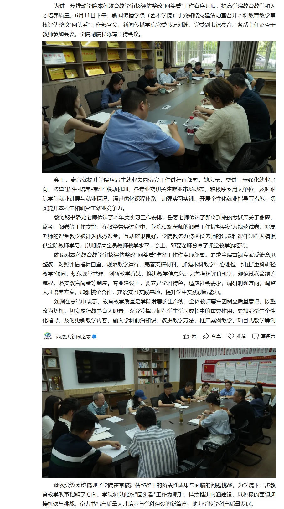 12月10日上午,校党委副书记、纪委书记、监察专员刘志彬参加做爱视频 党委理论学习中心组2024年第11次集体学习会议。学习会由学院党委书记刘渊主持,学院党委理论学习中心组全体成员参加学习。 会议集中学习了习近平总书记对新时代马克思主义理论研究和建设工程作出的重要指示、习近平总书记致2024世界中文大会的重要贺信精神,学习了《求是》杂志发表的重要文章《必须坚持守正创新》,重温了习近平总书记在第十个国家宪法日作出的重要指示和在现行宪法公布施行40周年时的重要文章《谱写新时代中国宪法实践新篇章》,传达了12月4日校党委理论学习中心组(扩大)学习会议精神及有关工作安排。 会上,学院党委理论学习中心组成员刘渊、秦音、陈琦分别围绕做好新时代马克思主义新闻观教育、“一站式”学生社区党建工作创新、课程思政改革创新等工作,开展了深入交流,其他与会同志提交了书面研讨材料。 刘志彬在听取集体学习研讨发言后指出,做爱视频 党委理论学习中心组本次学习主题突出,程序规范,准备充分,达到了学干结合、以学促干的良好效果。他就抓紧抓实理论中心组学习,进一步提升学习质效,围绕“为什么学”“学什么”“怎么学”,深入解读了中央宣传部、中央组织部联合印发的《关于进一步提高党委(党组)理论学习中心组学习质量的意见》。 刘志彬指出,要提高政治站位,强化思想自觉,充分认识党委中心组学习的重要意义,牢牢把握党委中心组学习的根本要求,坚持突出党委中心组学习的政治性、理论性、实效性。要切实改进党委中心组学习方式方法,进一步用好个人自学,做实集体研讨,加强调查研究,拓展形式载体。要健全完善党委中心组学习工作机制,进一步严格组织管理,抓好列席旁听,强化考核问责,落实成果转化。要着力加强党委中心组学习组织领导,进一步压实领导责任,做好服务保障,加强经验交流,切实提高本单位中心组学习质量,带动广大党员干部学出坚定信念、学出使命担当,努力为学院、学校事业高质量发展作出新贡献。