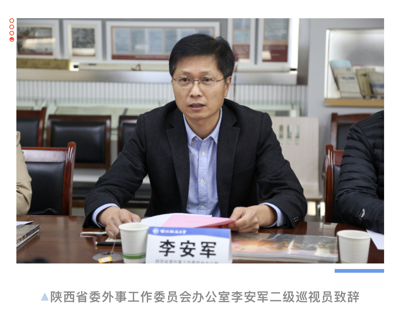 2020年11月13日上午,陕西省委外事工作委员会办公室二级巡视员李安军、新闻信息处处长张小东、副处长李菡以及白玫洁莅临我院进行工作调研并座谈。