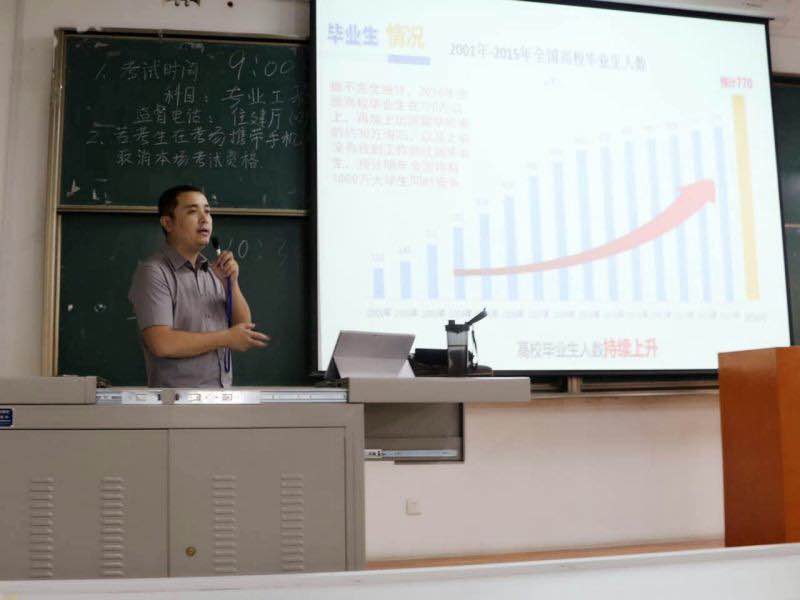首先,李主任从毕业生即将面临的就业与择业的形势方面入手,深入浅出的分析了2017年高校毕业生就业形势、往届毕业生就业情况、我校毕业生的就业流向 以及相应的就业对策,讲述了应届毕业生在就业形势复杂严峻下面临的三种压力,其中除了经济放缓与毕业生总量持续增加外重点分析了各类矛盾突出的问题,指出 了大学毕业生就业与劳动力市场供需产生错位及大学生对自身分析以及社会就业现状了解不足等问题。