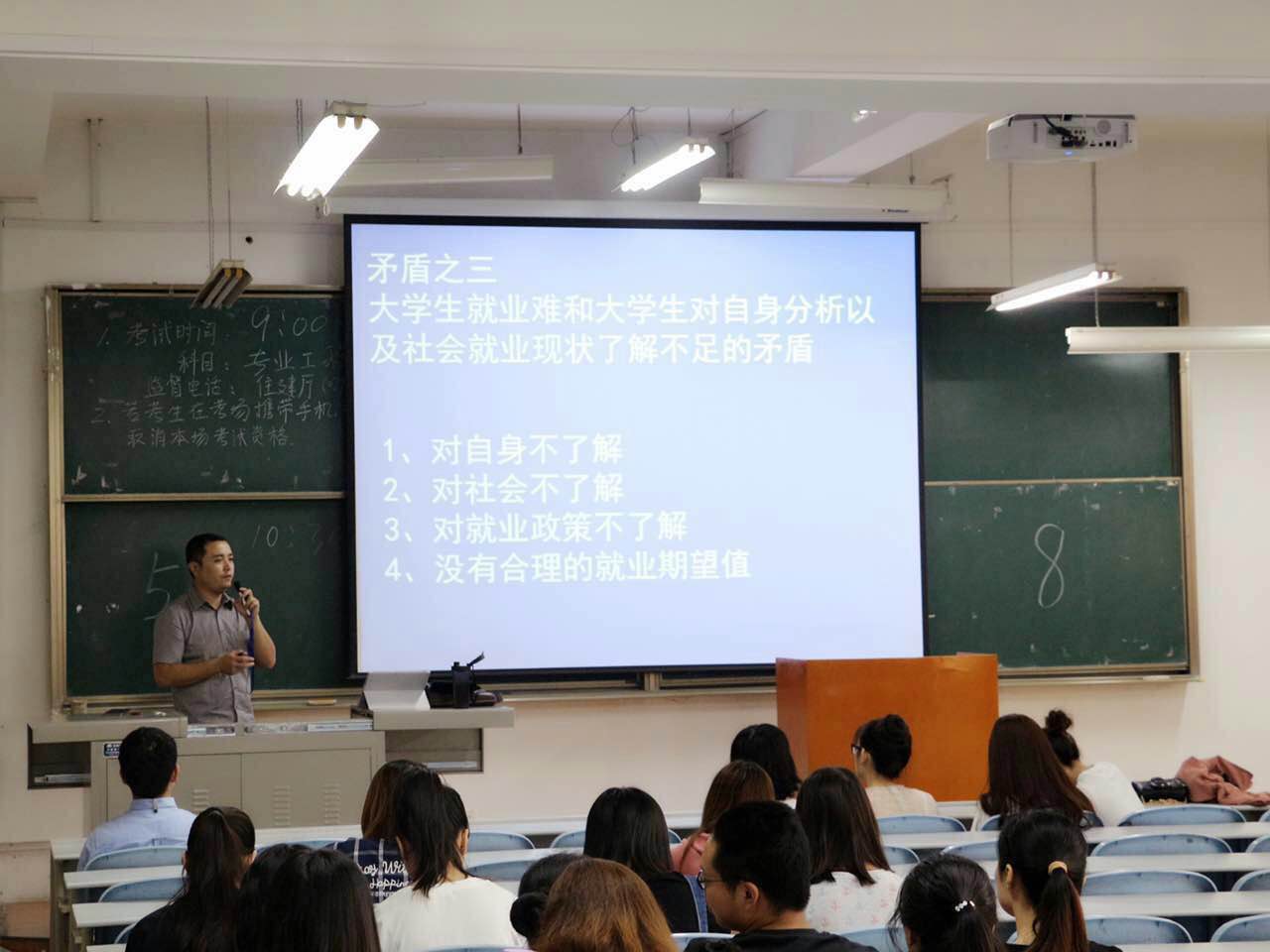 在会议中,李主任不断提醒大家多从环境中的合理一面去对待工作岗位与自己理想的工作岗位中实际的差异,为应届毕业生摆正心态,积极进取,未来升职提出了 一些可行性提议。“世界上没有两片相同的树叶,我们人也是一样。”李主任建议我们做一份职业测评,正确认知自身的长短板,理性选择适合自己的职业。随后, 李主任以“只要是人,就会找到工作”小结了本次讲座,希望应届毕业生可以积累一些面试求职的经验,为将来真正的面试打下基础。最后,李主任列举出我校毕业 生在求职中存在的问题以及推荐了一些招聘信息获取的渠道。李主任用丰富的学生案例,生动的表述,简明的图表,热情的态度感染了在场的每一个人,讲座现场频 频报出热烈的掌声与欢笑声。