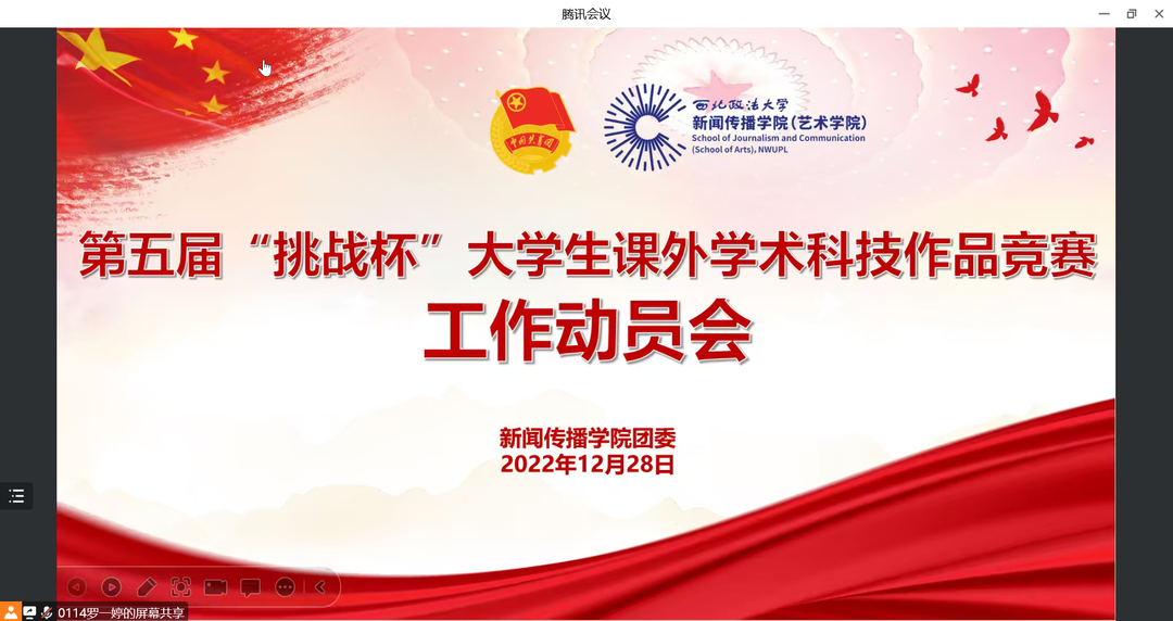会上,罗一婷对“挑战杯”竞赛工作的安排进行了说明,对参赛时间、参赛对象、参赛作品类型、作品选题范围、相关注意事项等方面进行了详细的讲解。