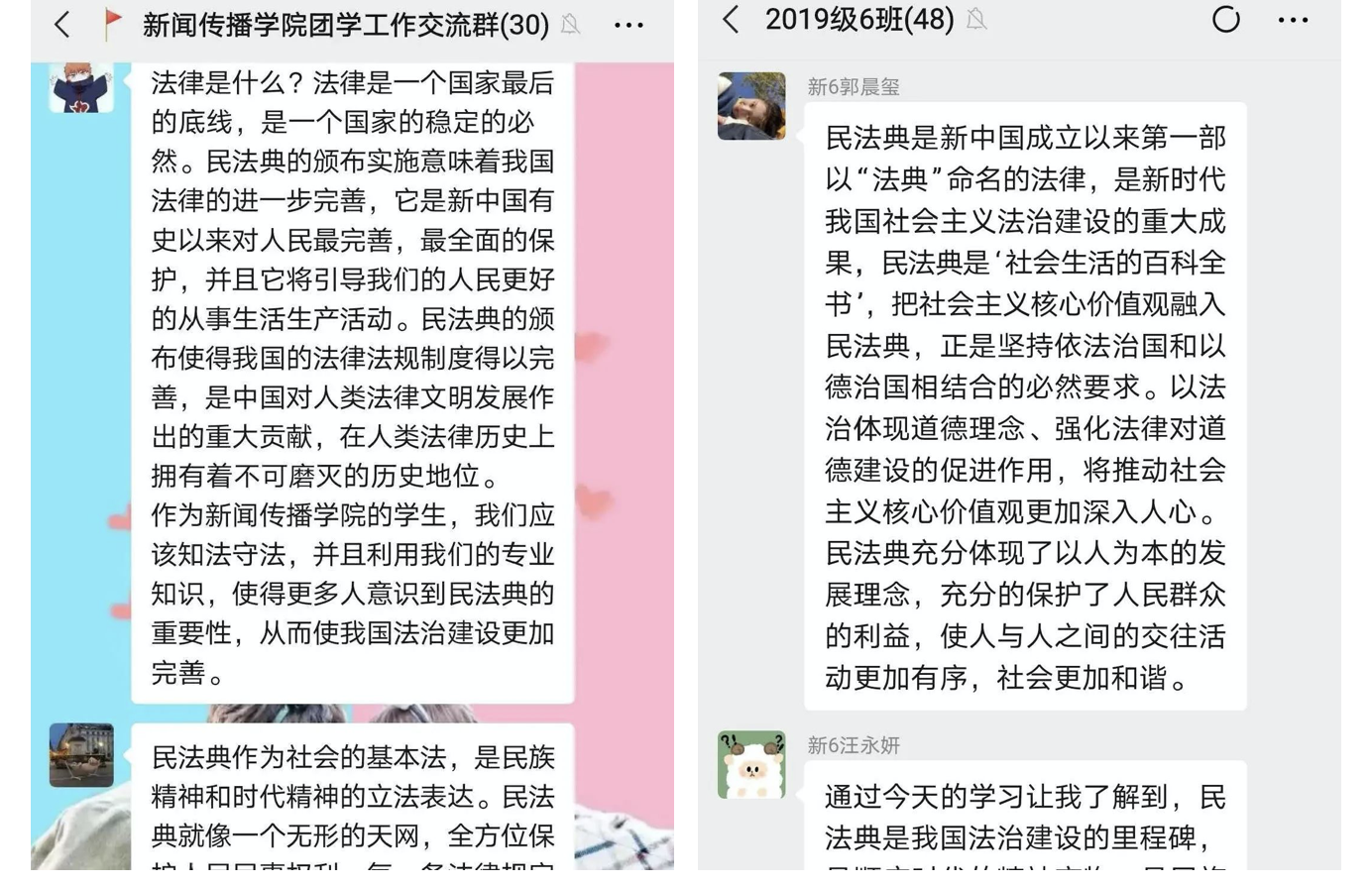 身为新传学子,我们应认真学习并宣传《民法典内容,充分利用政法院校的优势,对《民法典》进行系统、深入的学习,为以后的学习、工作做好准备。