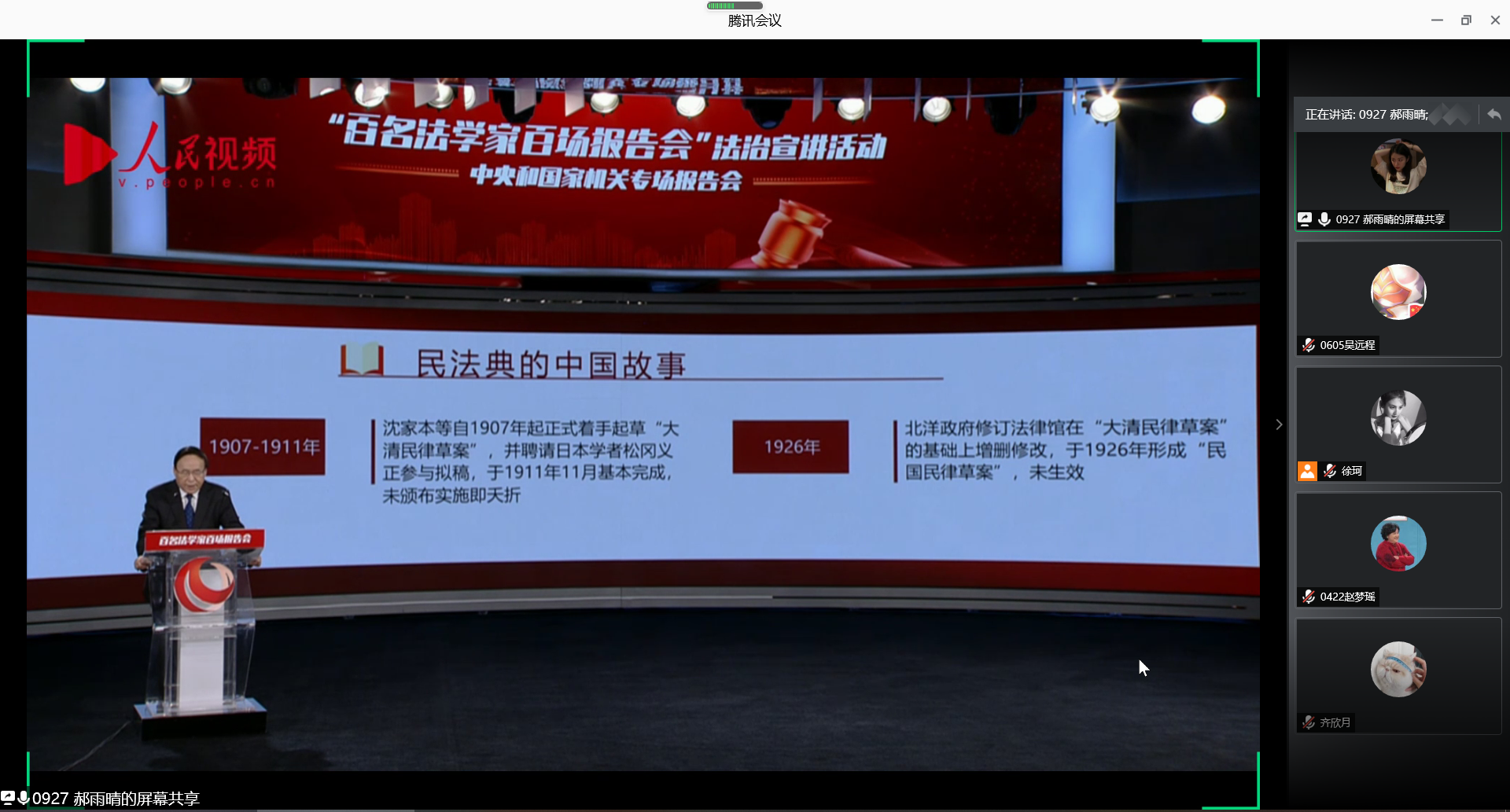 为深入学习宣传贯彻好《民法典》,根据学校相关安排,2020年7月29日下午,我院组织全体师生线上观看“百名法学家百场报告会”法治宣讲活动。本次宣讲活动以“宣传贯彻《中华人民共和国民法典》”为主题,由中国法学会党组书记、常务副会长陈训秋主持,中国法学会党组成员、学术委员会主任张文显主讲。