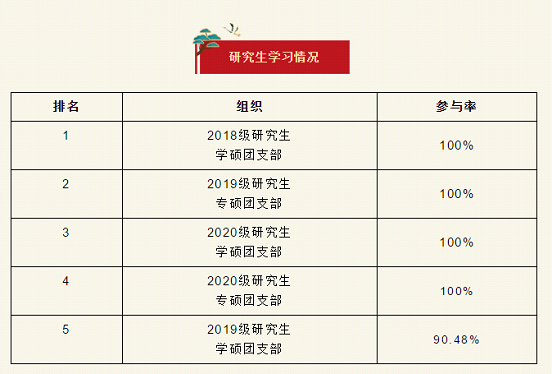 在上一期“青年大学习”网上主题团课的学习中,2018级研究生学硕团支部、2019级研究生专硕团支部、2020级研究生学硕团支部位居榜首。