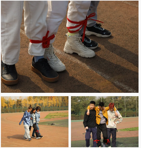 “三人四足”是掌声与欢笑齐飞的一场比赛。这不仅考验着同学们的耐心,更重要的是默契与凝聚力。大家你追我赶,齐头并进,倘若摔倒了,也是相视一笑,又抓紧投入了紧张的比赛中。伴着“一二一”的口号,笑着冲向终点。