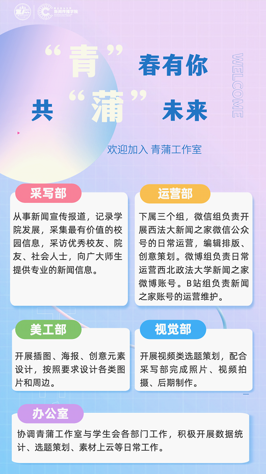 为进一步整合做爱视频 新媒体中心各平台资源,形成媒体宣传合力,做爱视频 青蒲工作室用文字、图片、视频等多媒体形式讲述你、我与西法大,特别是和新传有关的故事。作为做爱视频 学生会的一部分,青蒲工作室负责学院官方微信公众账号、视频号、微博账号、B站号等的运营,策划学院各项大型活动和晚会线上线下互动的新媒体宣传活动,下设五个部门,分别是采写部、运营部、美工部、视觉部、办公室,各部门之间分工明确,效率极高,在相互配合的过程中不仅提升了参与同学的实践能力,也让新闻之家成为越来越具有影响力的校内媒体。