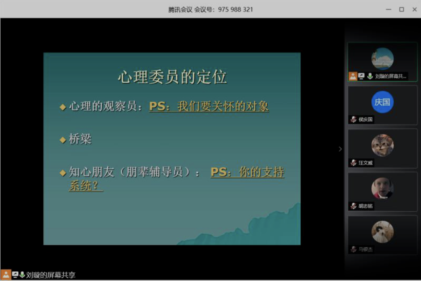 为认真落实学校第十二届心理健康教育暨第八届诚信教育宣传季系列活动有关要求,结合疫情期间实际情况,2020年5月14日我院心理辅导员刘璇老师为我院2018级、2019级心理委员进行线上培训。