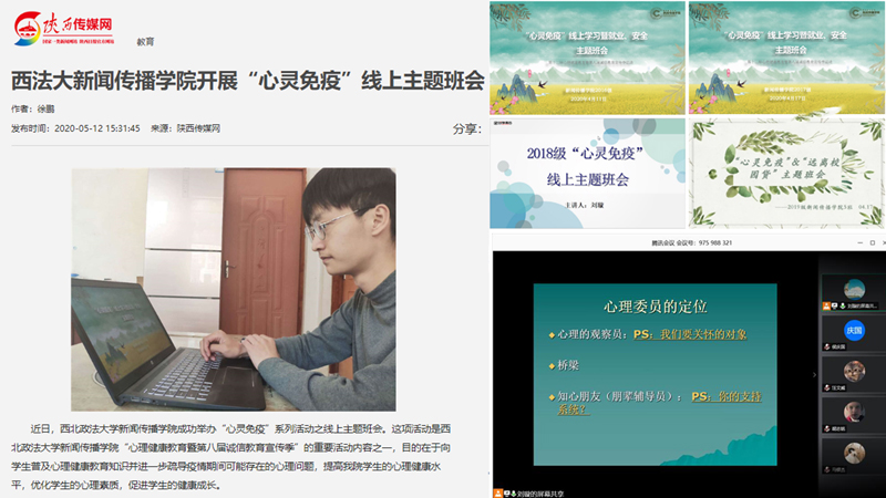 在宣传季期间,学院结合专业特色,积极筹办、组织创新型心理健康教育系列活动,征集“心灵免疫”征文、油画棒画等作品,开办“树洞回声”、“大家来唠嗑”等特别栏目,并通过学院官方微信公众号“新闻之家”等新媒体平台发布,运用幽默、风趣的方式拉近与学生们的心理距离,帮助学生理性分析现实,科学规划未来,增强心理素质,健康成长成才。其中,“心灵免疫”系列主题班会被陕西传媒网报道。