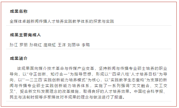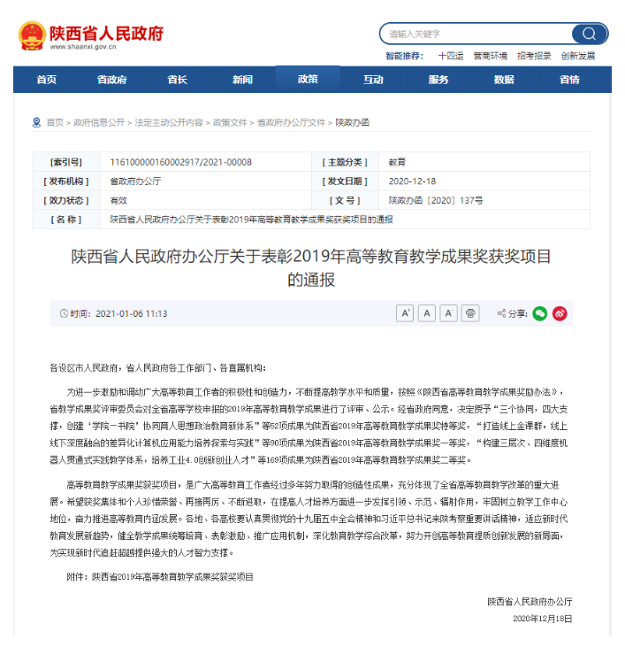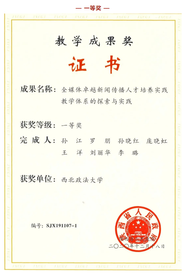 近日,陕西省人民政府办公厅发布了《关于表彰2019年高等教育教学成果奖获奖项目的通报》(陕政办函〔2020〕137号),我校获得省级教学成果奖7项,其中特等奖1项、一等奖2项、二等奖4项,获奖数量和等级均创学校历史最好成绩。其中,我院“全媒体卓越新闻传播人才培养实践教学体系的探索与实践”获得一等奖。