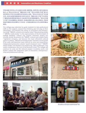 学院注重引导学生以专业技能为支撑,拓展思路,发挥优势,提升创新创业能力。以“西法大文创沙龙”“播音主持工作室”“西法大传媒工作室”等为代表的首批大学生文化创意项目已经启动。目前,“西法大文创沙龙”已成为校园内最具影响力的文化空间。“播音主持工作室”分别与西安广播电视台新闻频道和四川广播电视台生活频道开展合作,联合主办《青春直播间》和《970说法》两个栏目。“西法大传媒工作室”已形成集策划、影视制作、新媒体营销为核心的业务链条。学院将继续开展相关项目的孵化工作并进一步探索创新创业与专业培养的融合路径。
