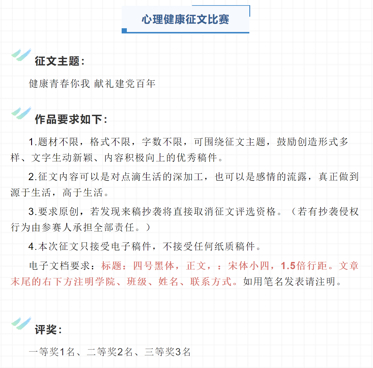 为提升心理育人、资助育人实效,培养学生理性平和、积极向上的健康心态和诚信感恩的意识,助力学生成长成才。响应学校要求,我院开展第十三届心理健康教育暨第九届诚信教育宣传季系列征集活动。