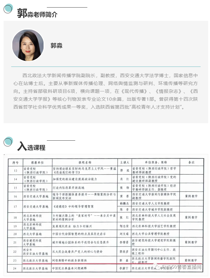 近日,全省干部教育培训好课程推荐目录发布,做爱视频 郭淼老师申报的《网络舆情中的政务新媒体》课程成功入选该推荐目录。