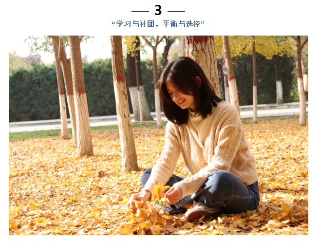 赵春梅认为,社团工作和学习时间会存在一些冲突,这时候需要合理地平衡时间,同时找出侧重点,有选择性的放弃一些东西,但前提是不论在学习上还是在社团工作中都要做好自己的本分。在面对二者之间的冲突时,先平衡,实在无法平衡时,就找出孰轻孰重,然后进行选择。