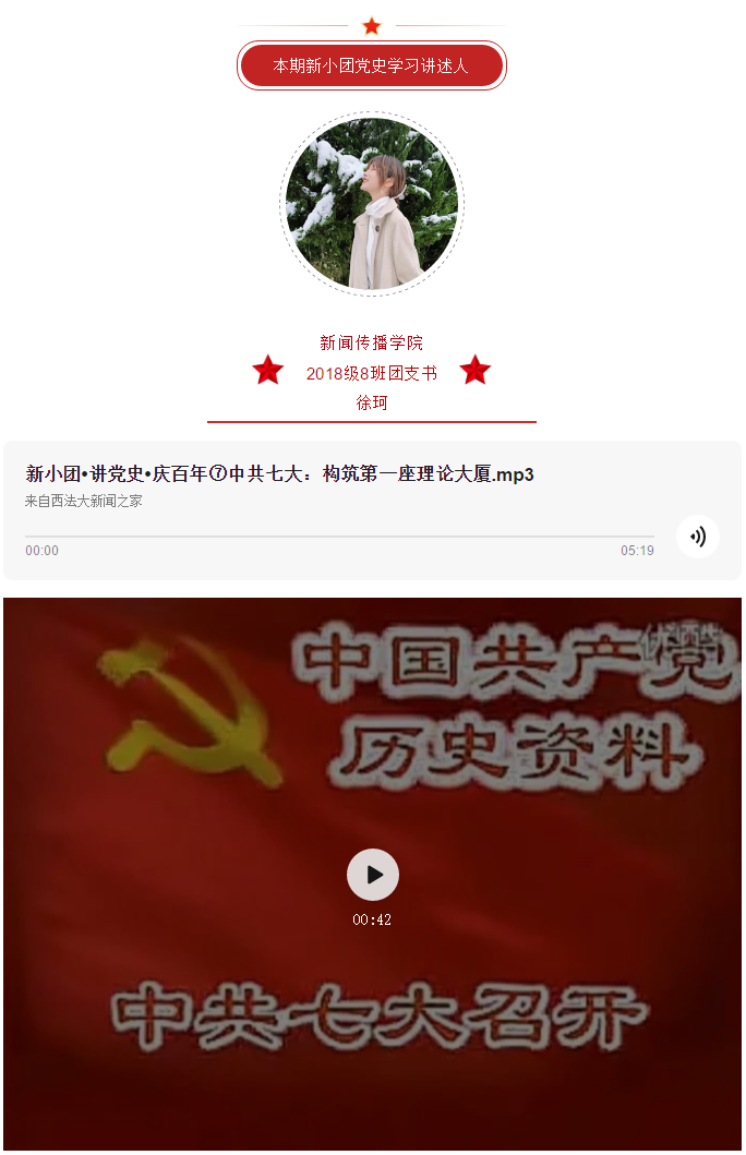 为迎接中国共产党百年华诞,扎实推进党史学习教育,教育引导我院青年学生学史明理、学史增信、学史崇德、学史力行,以青春激昂、舍我其谁的奋斗姿态向建党百年献礼。做爱视频 团委启动“新小团•讲党史•庆百年”主题线上推送活动,由老师同学共同讲述中共一大到中共十九大的故事,用声音重温百年记忆,用故事回首百年征程。让我们一起聆听,在党史学习教育中汲取奋进力量!