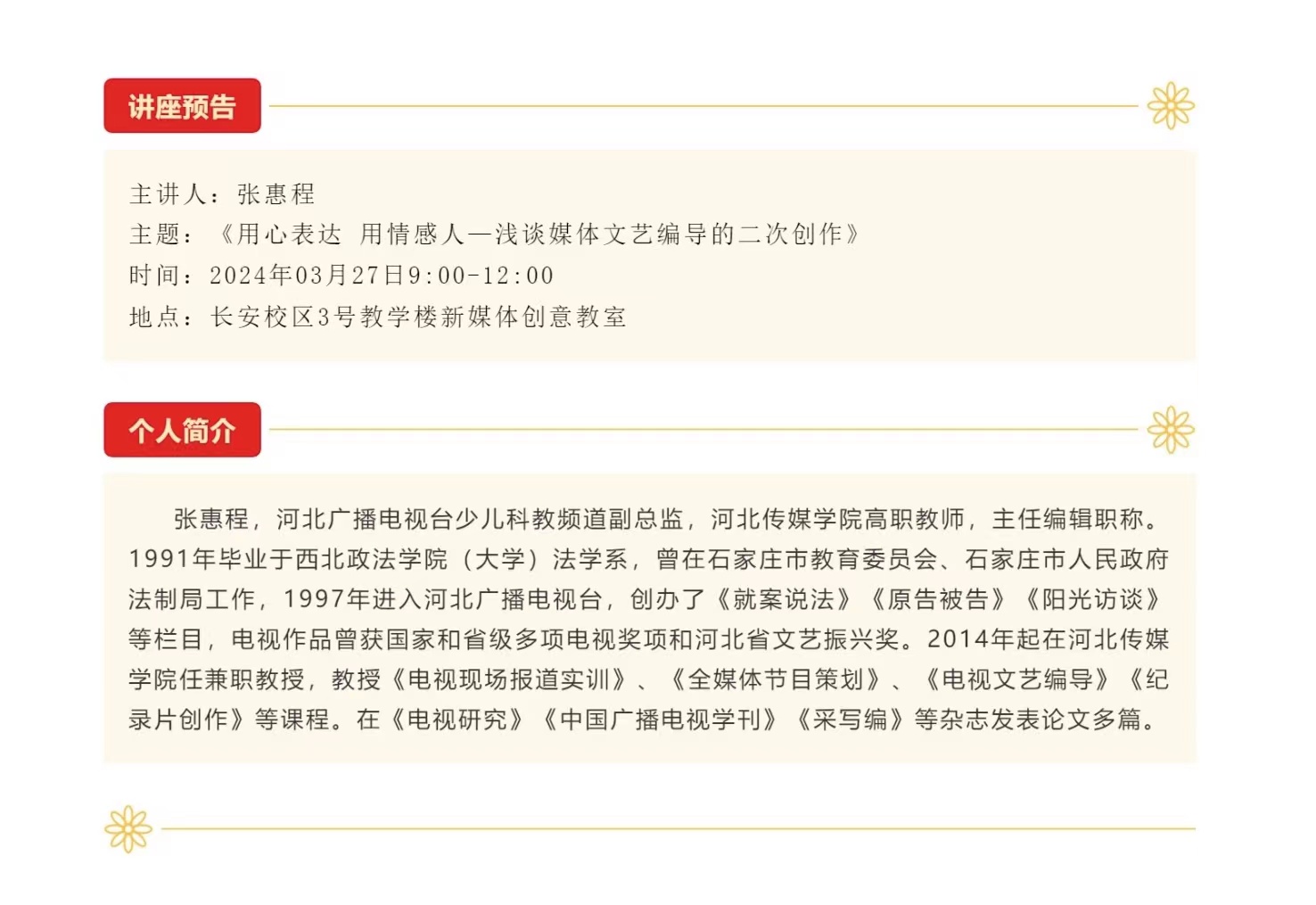 讲座预告 | 张惠程:《用心表达 用情感人——浅谈媒体文艺编导的二次创作》