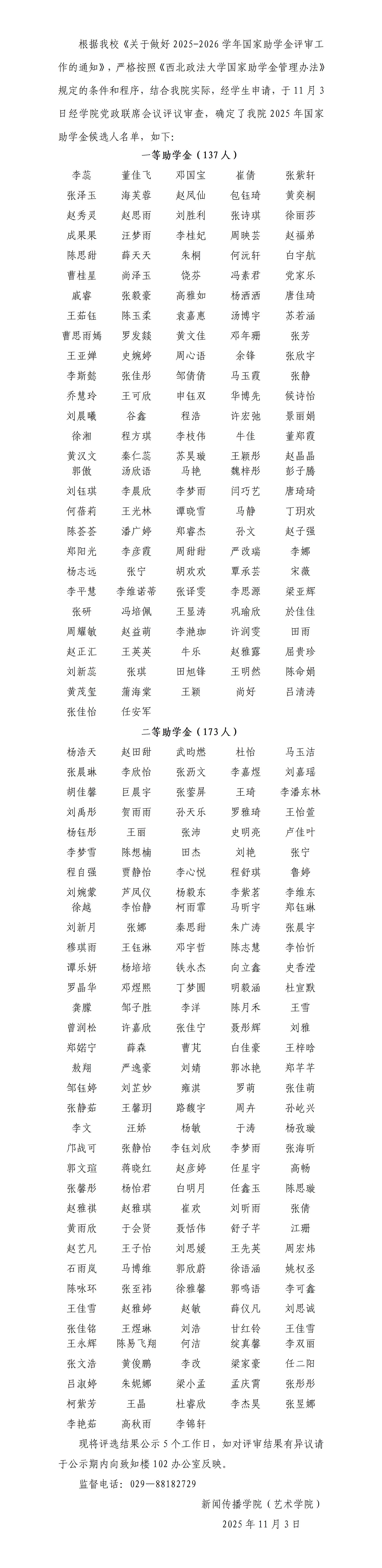 关于做爱视频 2025-2026学年国家助学金评选结果的公示