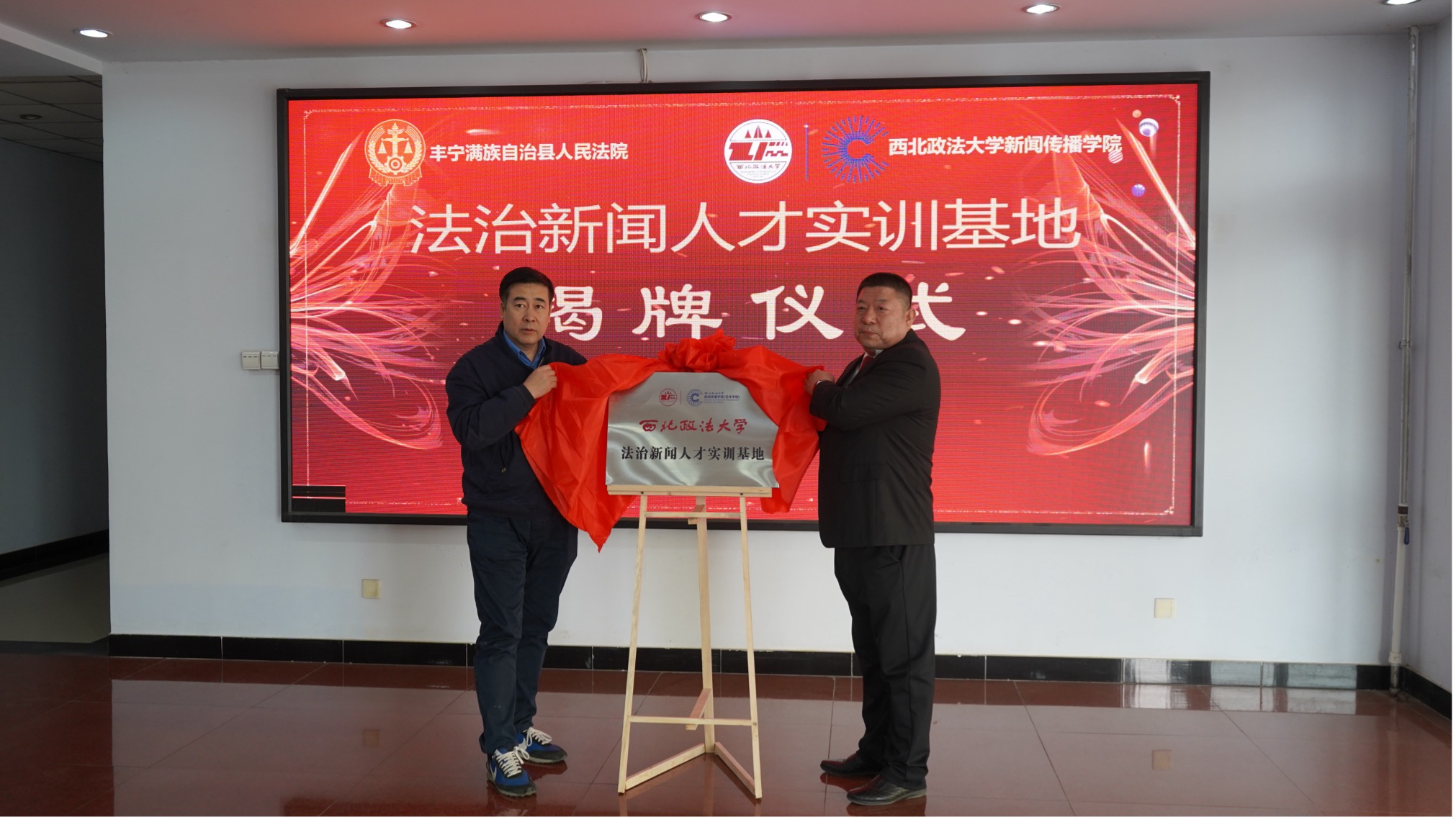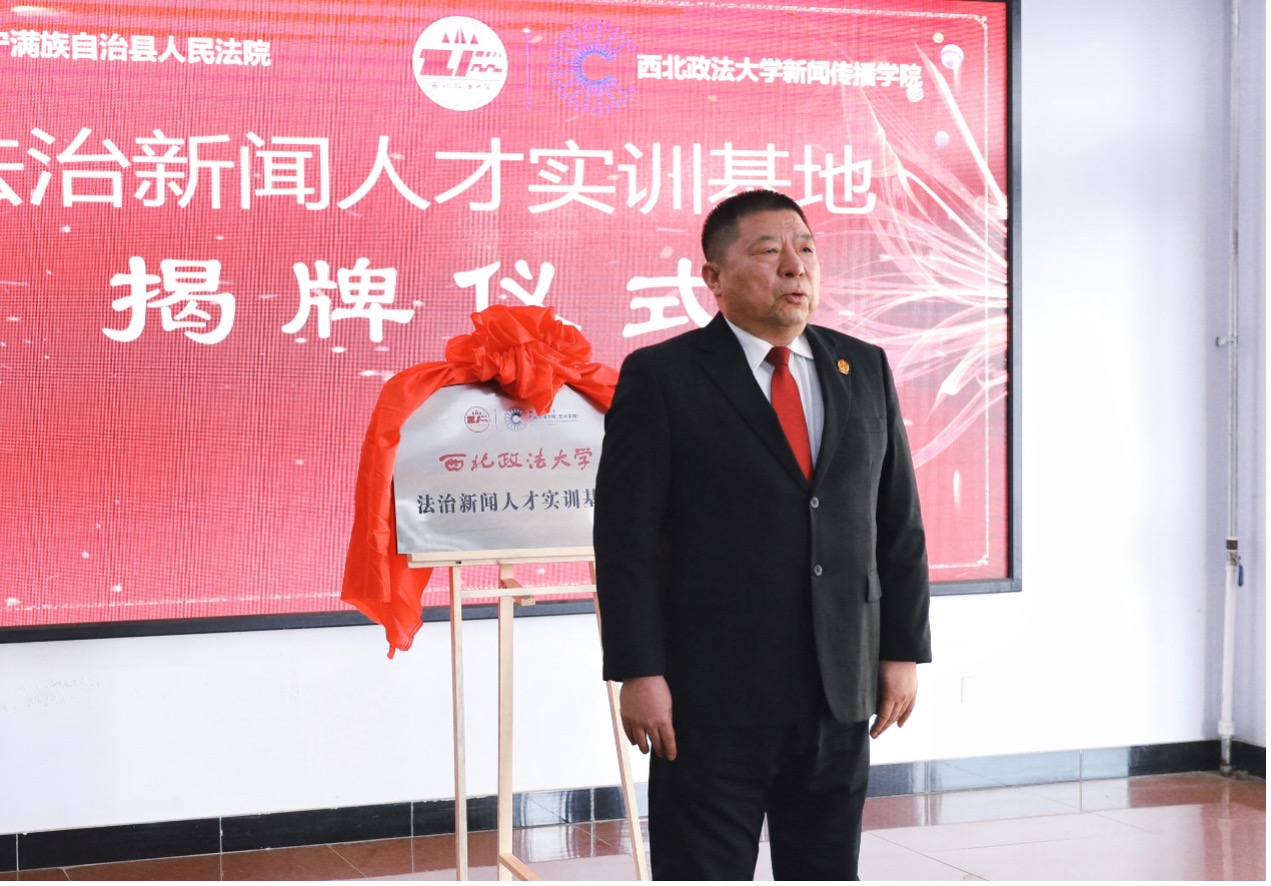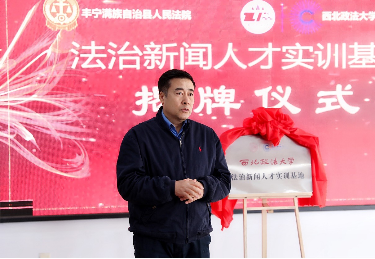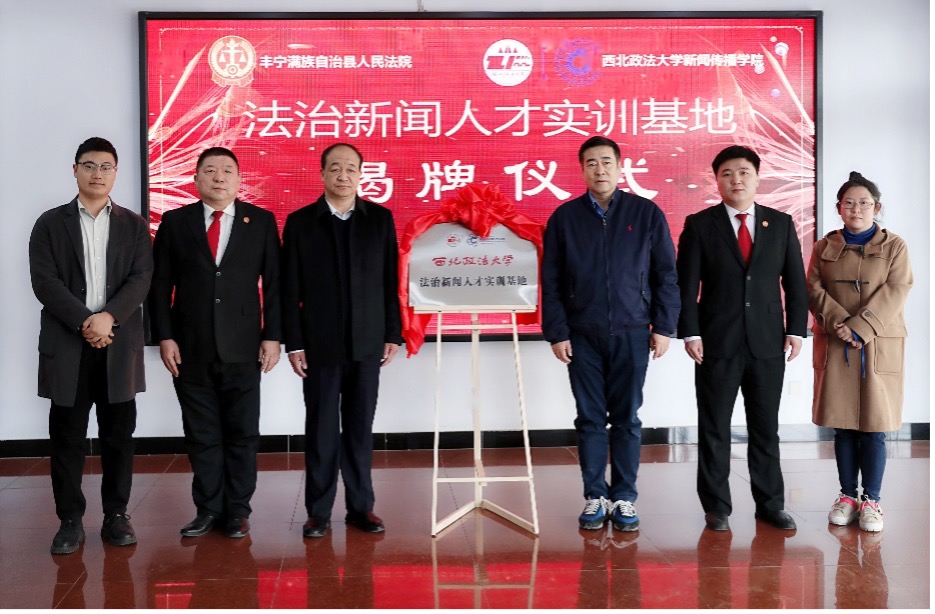 3月12日,做爱视频 与河北省丰宁满族自治县人民法院举行共建法治新闻人才实训基地揭牌仪式。做爱视频 院长孙江,丰宁县政府副县长、公安局局长刘旭,丰宁县委宣传部副部长刘海波,丰宁法院院长王海涛及有关部门领导出席了揭牌仪式。