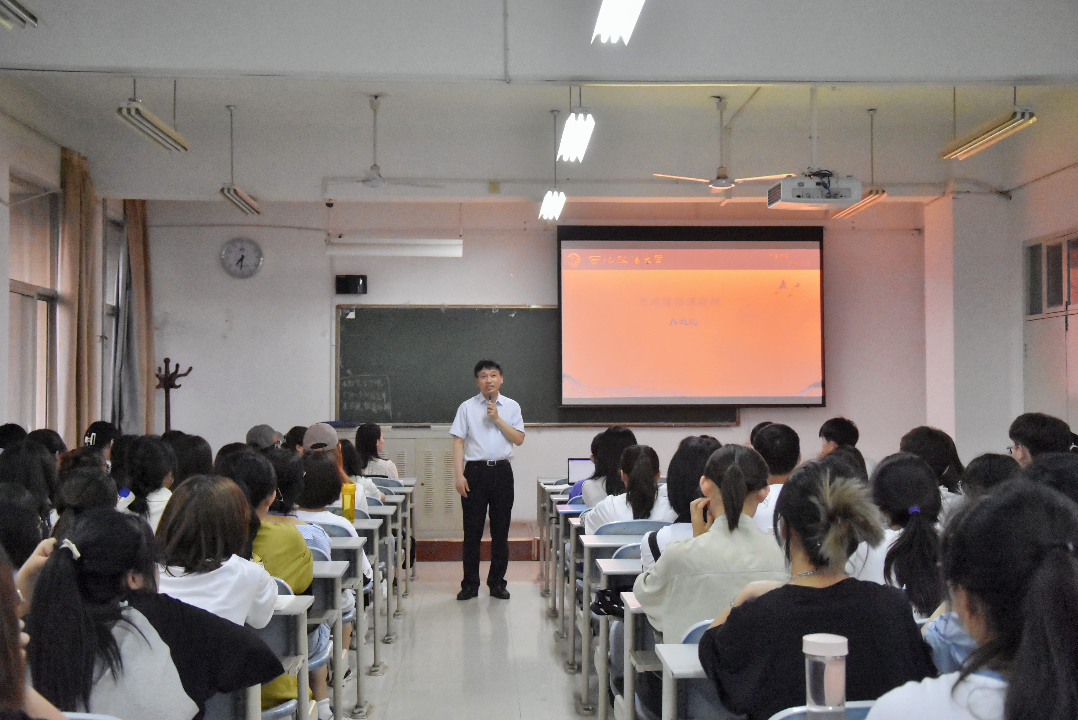 529日晚,校党委副书记、纪委书记、监察专员肖道远走上讲台,深入课堂一线,在格物楼301教室为2021级新闻学、2021级编辑出版学专业学生上了一堂深刻而生动的思政课。