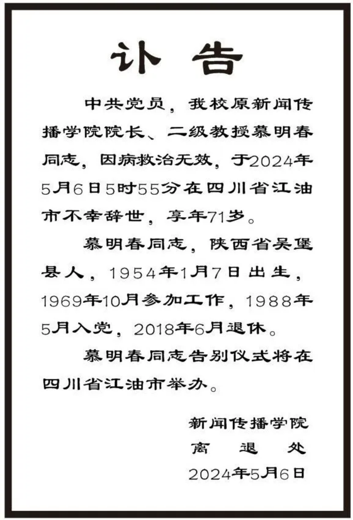 慕明春教授致力于新闻传播教育事业,为我校新闻传播教育在全国新闻教育中彰显特色做出了突出贡献,他在法治新闻及传媒法研究领域取得的突出成就,成为这些领域宝贵的学术资源。他的离去,是我院的重大损失,也是新闻传播教育界的重大损失。