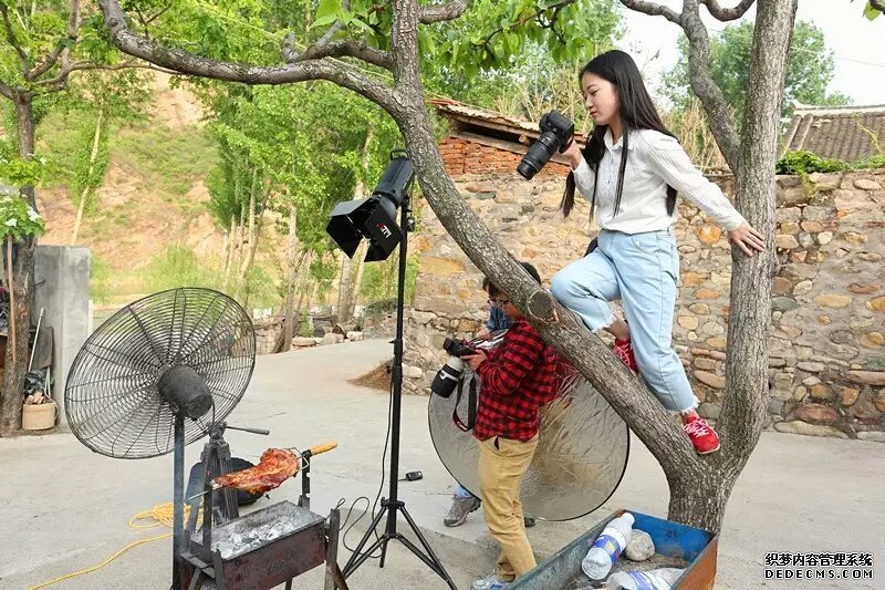 摄影小学妹拼了,身高不够树来凑