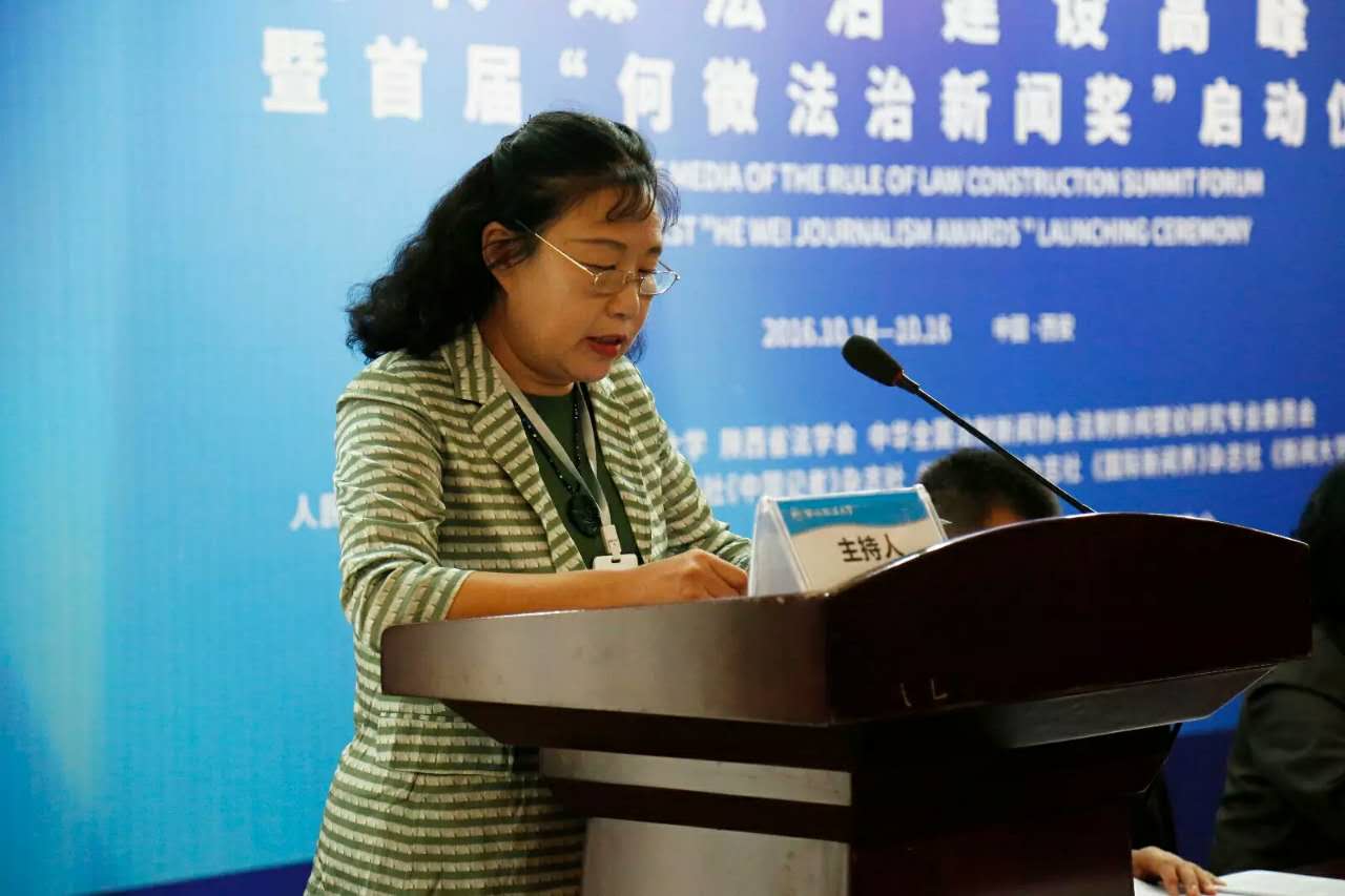 《中国记者》杂志社文璐总编辑对于本次活动给予高度评价,她认为“何微法治新闻奖”这个平台的设立体现了主办方的开阔眼界及在法治与新闻专业领域的深入研究。她表示,学界与业界需要共同的责任担当,谋求新闻理论、新闻教育、新闻实践方面的合作,在新的格局下发挥社会组织的积极作用,推动我国传媒法治建设。