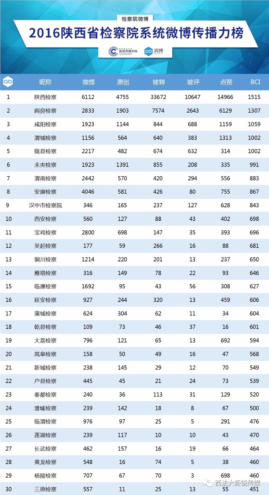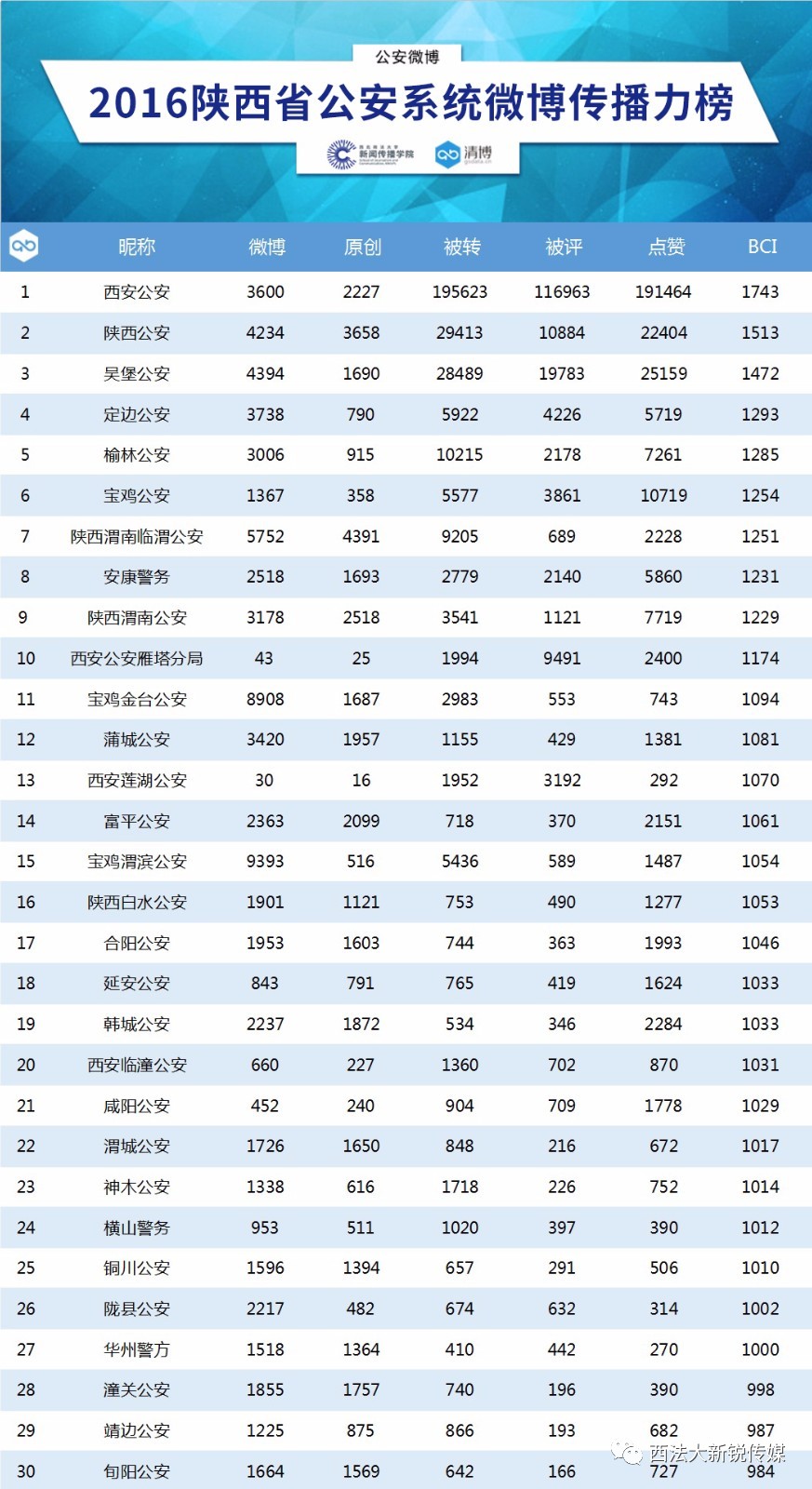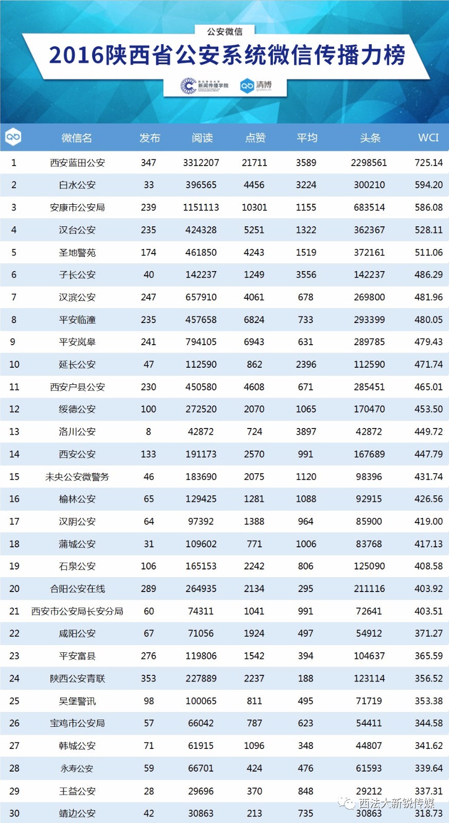 2016陕西公检法司“双微”传播力榜单是依托中国新媒体大数据权威平台“清博指数”数据模型,根据日均阅读数、日均点赞数、篇均阅读数、篇均点赞数等评价维度,运用WCI、BCI评价体系综合计算而成。