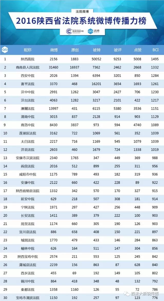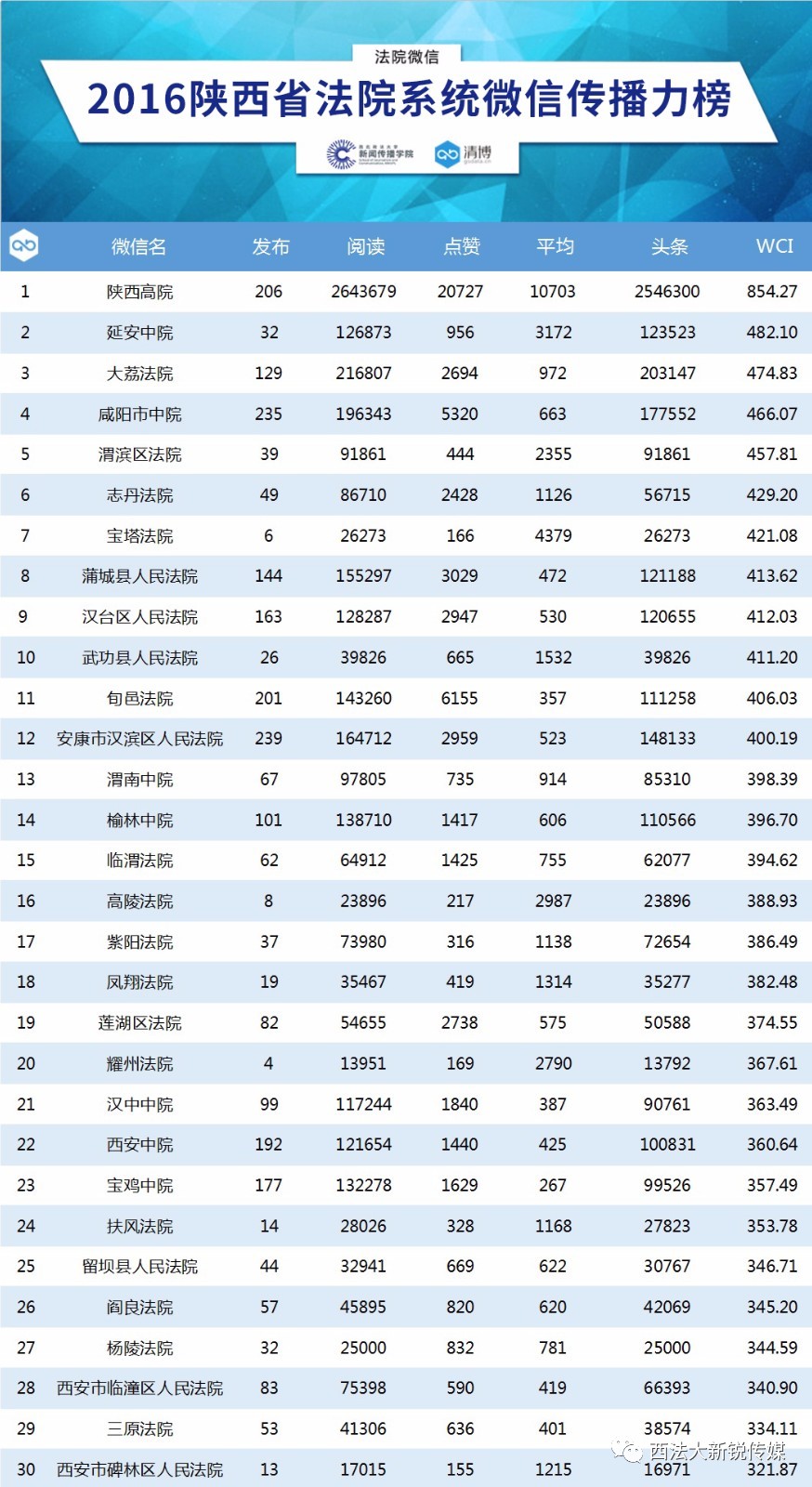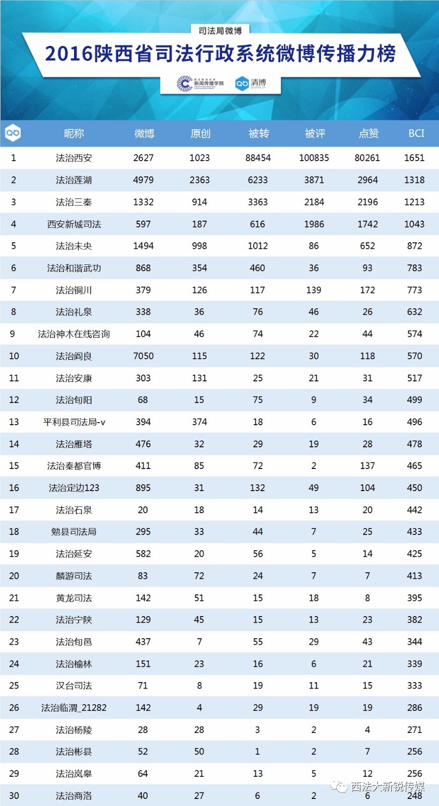 2016陕西公检法司“双微”传播力榜单是依托中国新媒体大数据权威平台“清博指数”数据模型,根据日均阅读数、日均点赞数、篇均阅读数、篇均点赞数等评价维度,运用WCI、BCI评价体系综合计算而成。