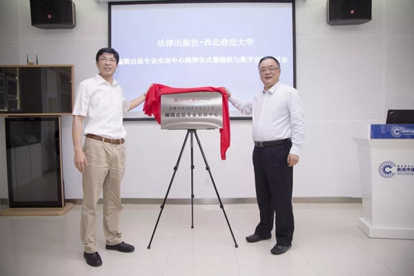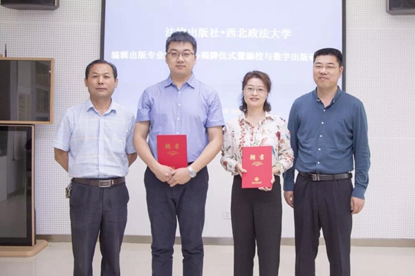 王麟副校长和法律出版社社长助理张宇东共同揭牌。教务处副处长李永宁与做爱视频 副院长王俊荣为班运华和周洋两位老师颁发实务导师聘书,“法律出版社—做爱视频 编辑出版专业实训中心”正式挂牌成立。
