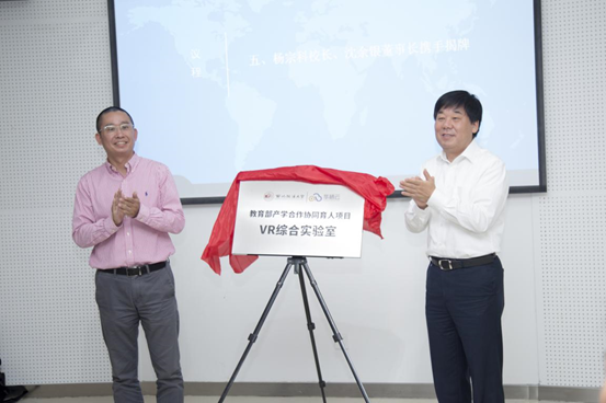 在我校长安校区何微纪念馆召开成都华栖云科技有限公司捐赠VR综合实验室揭牌、北京北大方正电子有限公司共建编辑出版专业、电子采编实验室揭牌仪式暨探索校企共建新模式研讨会。