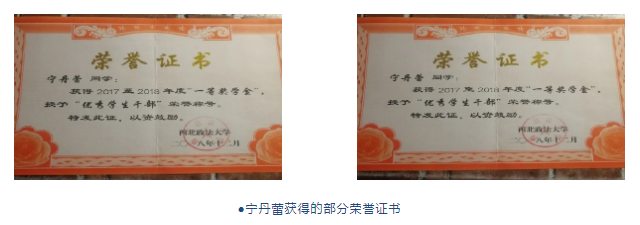 主要奖项:2017-2018年间获得国家励志奖学金;第二十三届校园艺术节“优秀个人”;一等奖学金,三好学生 ;2018-2019年间获得优秀共青团员;优秀“图管会”干部 ;一等奖学金,优秀学生干部;2019年6月获得第十届新闻采访大赛二等奖和第二届日日新纪录片大赛评委会特别推荐奖