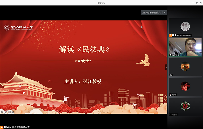 为贯彻落实习近平总书记在学校思想政治理论课教师座谈会上的重要讲话精神,按照中省、学校有关要求,结合我院实际情况,6月17日晚,院长孙江教授在线上为400余名学生解读《民法典》,用生动的形式,将《民法典》融入思政课堂,讲新讲活思政课,引导学生增强法治思维、法治意识和运用法律手段解决问题的能力。