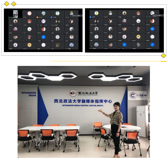 会议直播开始后,在王婧臻老师的指引下,大家共同参观了南校区的各个实验室,包括电子采编实验室、非线性编辑实验室、融媒体指挥中心、录音室、设备间、演播厅等。其中,非编工作站是我院产学研合作办学模式的新探索,由中广上洋公司提供设备;同时,在学生实践中,我院院媒西法大radio也与校外的社会广播电台多有合作,制作了“青春直播间”等特色节目。