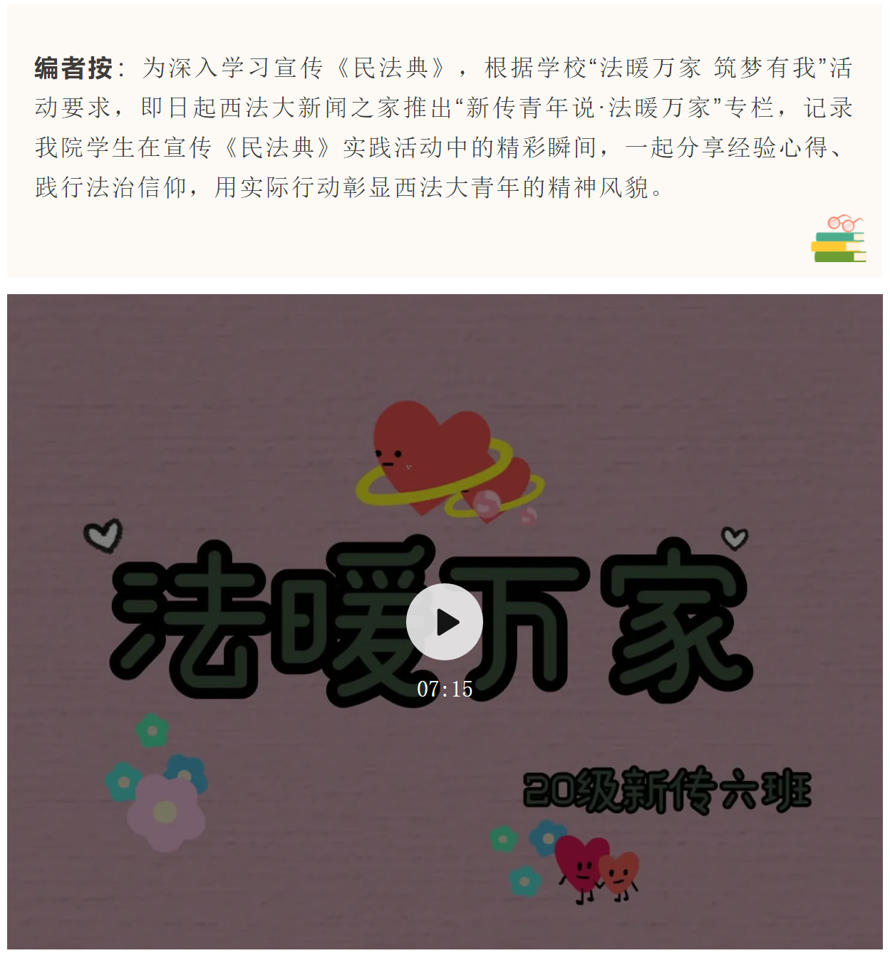 为深入贯彻学习习近平总书记关于加强《民法典》宣传工作的重要讲话精神,切实做好《民法典》学习宣传贯彻工作,营造师生懂法、学法、用法的良好法治氛围,我校开展了以“法暖万家,筑梦有我”为主题的《民法典》普法宣传活动。2020级新传6班王怡梓晗、曹宇琪和祁澳积极参加了本次活动。王怡梓晗作为代表接受了新闻之家的采访。他们将活动分成“线上填写问卷”与“线下采访”两个部分。通过详细调查,基本了解了受众对于《民法典》颁布关注程度和自身看法。针对“为何将访问空间定位在了二十岁以下的青少年?”这一问题,王怡梓晗答道:“主要原因有两个。一是青少年是一个国家的未来,他们运用法律保护自己的意识是相较于其他年龄段更薄弱一些的群体,志愿者希望通过本次活动可以提高他们的法律意识,在初入社会时更好的保护自己的合法权益。二是因为志愿者与受访者年龄相仿,可以更直接更贴切地交流。”在王怡梓晗看来,此次有关《民法典》普及的街头采访活动收获颇丰,不仅让部分在读大学生及高中生对《民法典》有了初步了解,还让《民法典》在全社会的普及起到了有效宣传的作用,这对我国弘扬法治精神、普及法律知识,使法律教育经常化、规范化、行为化具有相当重要的意义。