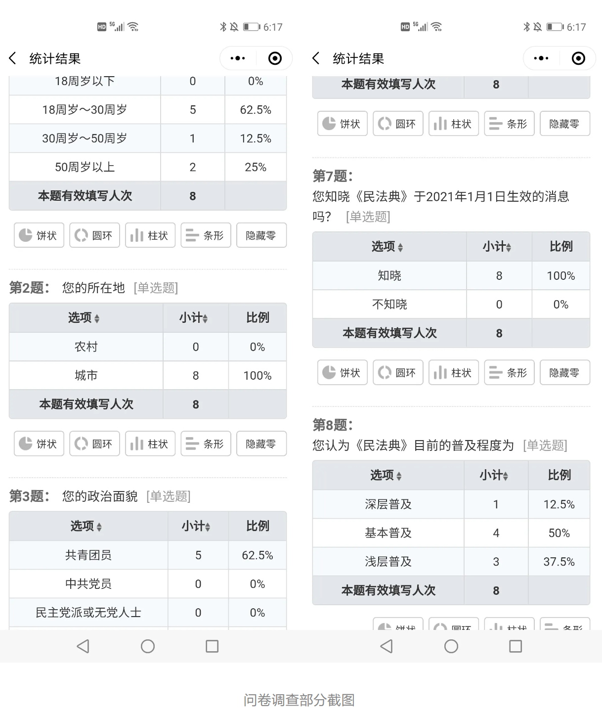 在选取调查方式上,王怡梓晗也有自己的认知:“此次调查采取线上线下两种方式同时进行,是为了保证受调查的群体具有一定的广泛性,线上调查包括了一些中年群体。对于中年群体以及中老年群体来说,他们对《民法典》的了解不像学生或者青年学术研究群体一样系统,这使得中老年群体更注重《民法典》在生活中的实际性,也就是能否切实有效地维护到自己的权利这一方面。这让我意识到《民法典》的普及亟待加强,相关部门应当加大力度去提高人们对于《民法典》的了解程度,真正使人民能够做到知法懂法用法。总体来讲,这次的调研活动使我们受益匪浅,我们不仅了解了《民法典》的知识,还明白了自身的不足,在接下来的活动中要积极参与,提高自己的法律素养。”