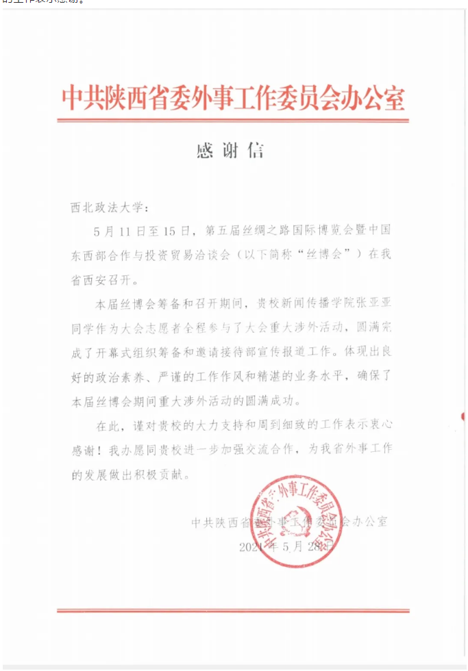 5 月 11 日至 15 日,第五届丝绸之路国际博览会暨中国东西部合作与投资贸易洽谈会(以下简称“丝博会”)在西安召开。我院学生张亚亚同学在丝博会筹备和召开期间,作为大会志愿者全程参与了大会重大涉外活动,圆满完成了开幕式组织筹备和邀请接待部宣传报道工作。张亚亚同学体现出良好的政治素养、严谨的工作作风和精湛的业务水平,确保了本届丝博会期间重大涉外活动的圆满成功。最后,中共陕西省委外事工作委员会办公室还表示,愿同我校进一步加强交合作,为我省外事工作的发展做出积极贡献。