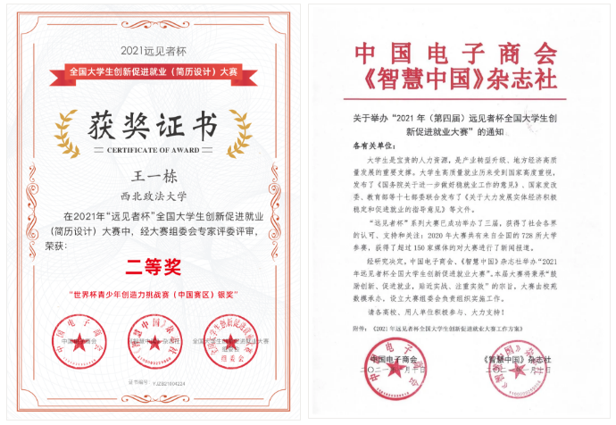 王一栋同学曾获来自中国商业经济学会、中国管理科学研究院、中国国际教育电视台、中国摄影家协会、全国高校创新创业教育教学委员会、中国公益创业研究中心、中国绿发会、中国信息协会、中国电子商会等颁发的各类全国性奖项四十余次。此次获得“远见者杯”全国大学生创新促进就业大赛二等奖,为自己的履历又添光彩。