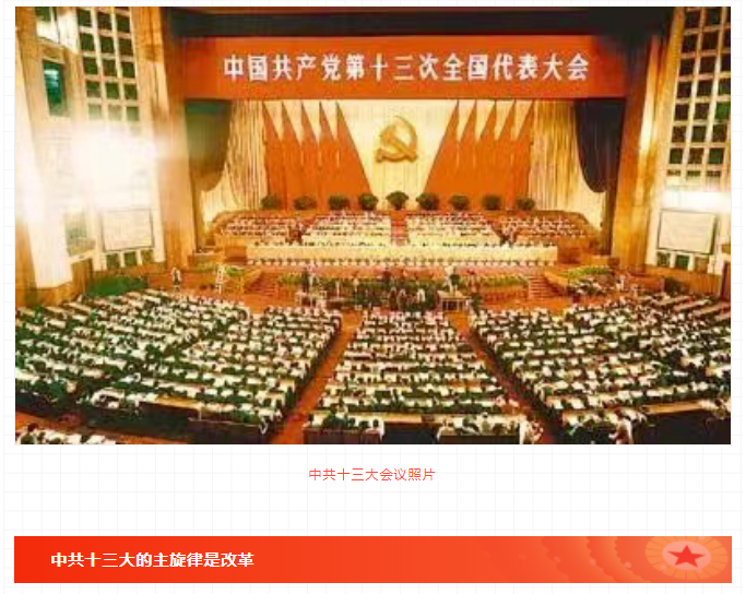 中共十三大的主旋律是改革,报告指出,这次大会的中心任务是加快和深化改革。改革开放是振兴中国的唯一出路,是人心所向,是大势所趋,不可逆转。经济改革要深化,政治体制改革要出台。大会提出了进行政治体制改革的任务,指出:政治体制改革的长远目标,是建立高度民主、法制完备、富有效率、充满活力的社会主义政治体制;改革的近期目标,是建立有利于提高效率、增强活力和调动各方面积极性的领导体制。大会提出了政治体制改革的各项任务,包括:实行党政分开,进一步下放权力,改革政府工作机构,改革干部人事制度,建立社会协商对话制度,完善社会主义民主的若干制度。