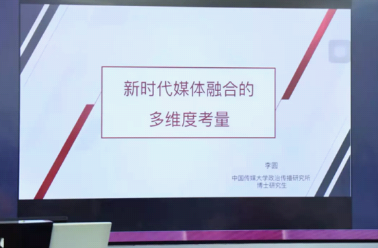 中国传媒大学政治传播研究所的李圆,其主题为《新时代媒体融合的多维度考量》。李圆将媒体分为四个阶段:全程媒体、全息媒体、全员媒体、全效媒体。最后李圆提出了关于加快推进媒体深度融合发展的意见。
