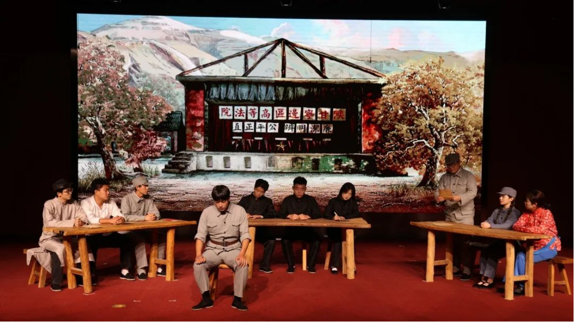 师生以1937年发生在“抗大”和“陕公”之间的“黄克功案”为素材,自编自导自演了红色法治舞台剧《庄严的审判》,向世人庄严宣示“共产党人犯法,无论以前功劳多么显赫,都必须执行比一般人更加严格的法纪”。剧目一经演出,即引起了强烈反响,人民网、中国网、学习强国平台、法制日报、陕西日报等多家中省媒体纷纷予以报道。同年,《庄严的审判》被中共陕西省委普法工作领导办公室评选为第四届陕西省高校法治文化节“五个一”优秀文艺作品奖。